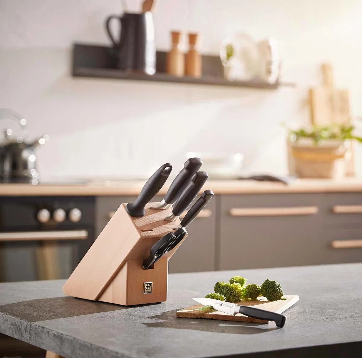 ست چاقوی zwilling سری Vier Sterne با بلوک چوبی طبیعی و قیچی چندمنظوره انتخابی ایدهآل برای کسانی است که به کیفیت، دوام و زیبایی در آشپزخانه اهمیت میدهند. این مجموعه شامل 7 پارچه چاقوی کاربردی آشپزخانه است که در بلوک چوبی مقاوم و زیبا به رنگ طبیعی (بامبو) قرار گرفتهاند.