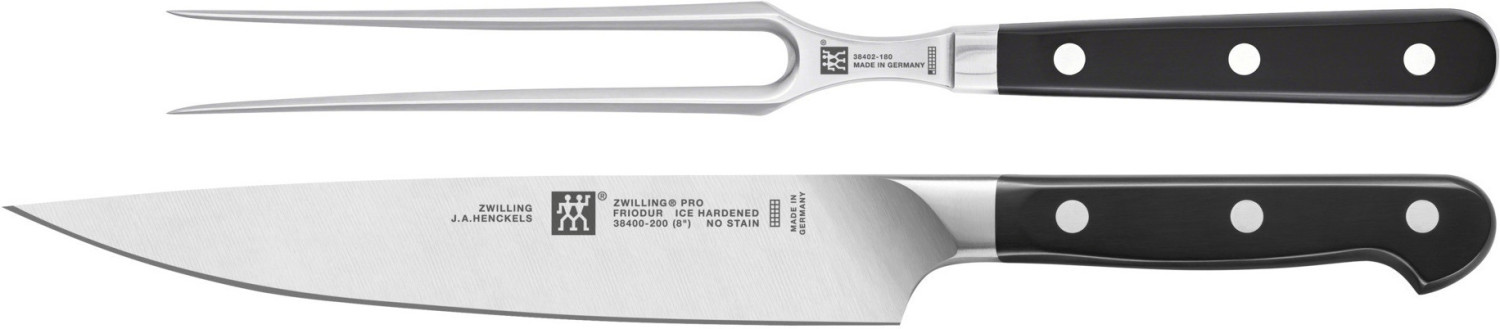 ست zwilling سری Pro ترکیبی از چاقوی تیز و چنگال مقاوم سرو است که برای برش و سرو انواع گوشت طراحی شده است. چاقوی برش با تیغه فولادی FRIODUR® برشهای دقیق و روانی را فراهم میکند و چنگال سرو استیل مقاوم به شما در کنترل بهتر حین سرو کمک میکند.