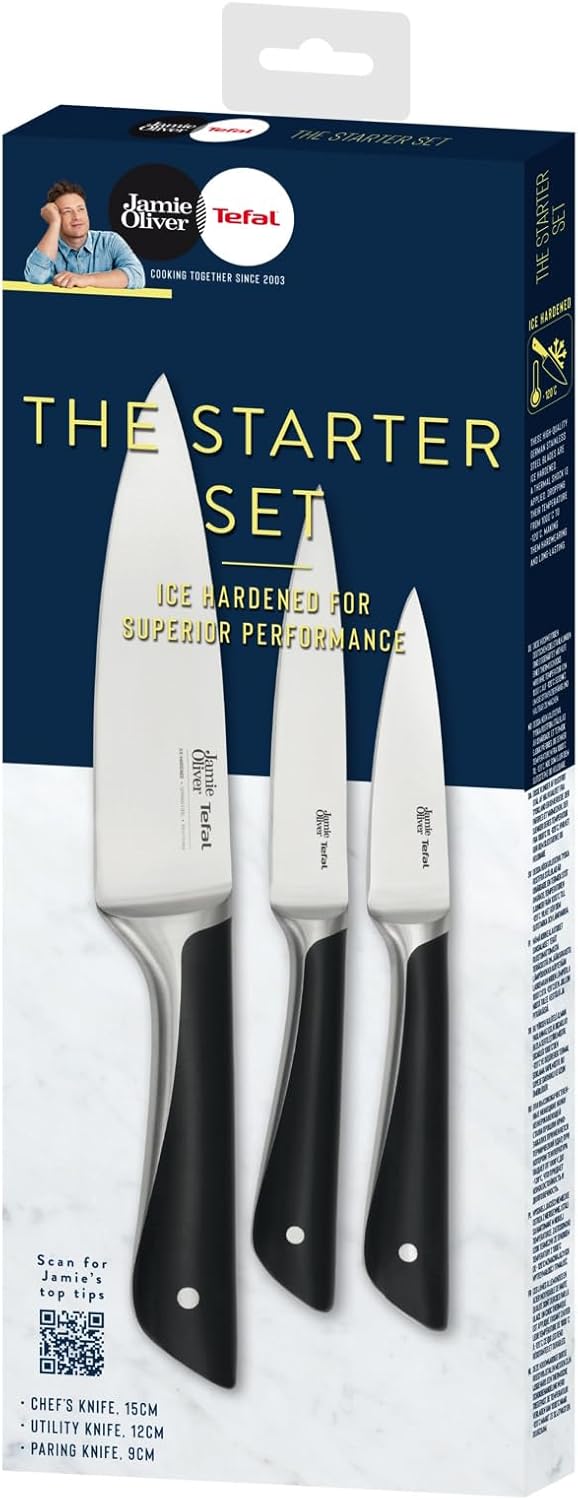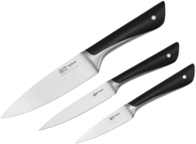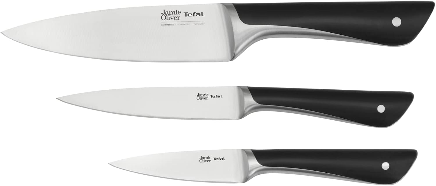 DAS STARTER-SET: Kochmesser 15 cm, Universalmesser 12 cm, Schälmesser 9 cm DAS EINZIGARTIGE KÜCHENMESSER-SET VON JAMIE OLIVER UND TEFAL: Hochwertige und bewährte Produkte, die das Zubereiten selbstgekochter Speisen zu einer wahren Freude machen. Die intelligente Wahl für deine Wohlfühlkost EISGEHÄRTET FÜR HERAUSRAGENDE LEISTUNG: Die hochwertigen Klingen aus deutschem Edelstahl sind eisgehärtet. Durch einen Temperaturschock, bei dem die Temperatur von 1000°C auf -120°C gesenkt wird, gewinnen sie an Widerstandsfähigkeit und Langlebigkeit HiER HABEN WIR EIN BESONDERS NÜTZLICHES TRIO: "Kochmesser, Schälmesser und Universalmesser. Lass uns kochen!" Jamie Oliver SCHÖNE, GEWICHTETE KÜCHENMESSER: Für einen komfortablen und sicheren Griff bei der Zubereitung deiner frischen Zutaten | قیمت یورویی : 93.01€
