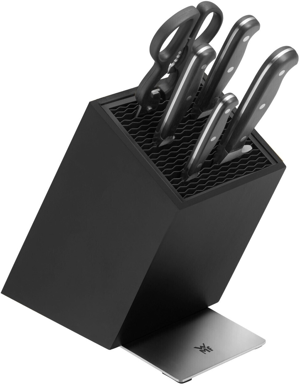 ست چاقو 6 پارچه WMF Spitzenklasse Plus با تیغههای استیل ضد زنگ و دستههای ارگونومیک مشکی، مناسب برای انواع برشهای حرفهای در آشپزخانه. همراه با پایه مقاوم مشکی برای نگهداری ایمن و شیک