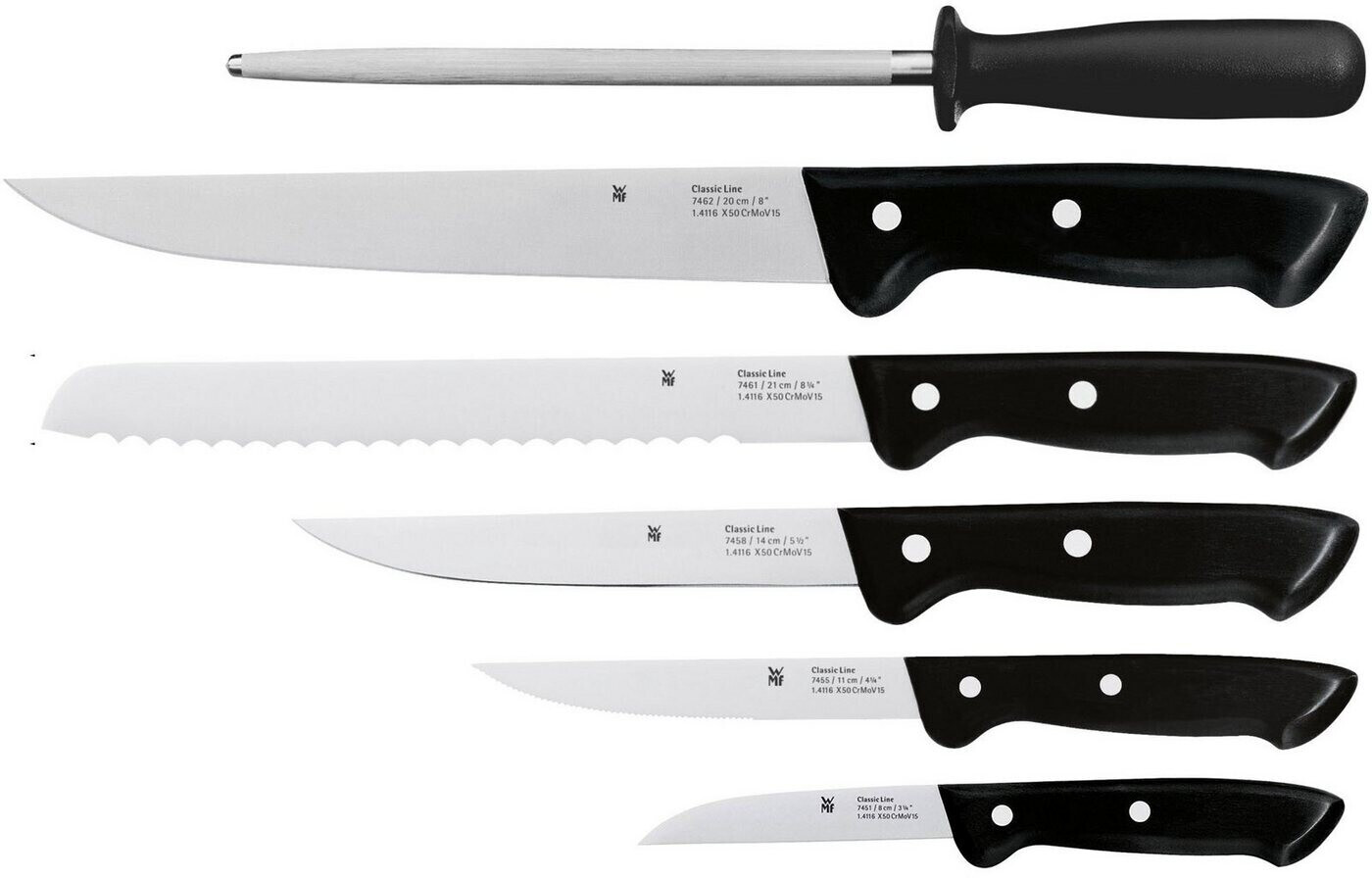 ست چاقو 7 پارچه WMF Classic Line شامل چاقوهای برش تیز و بادوام از جنس استیل ضد زنگ با فناوری FRIODUR® است.