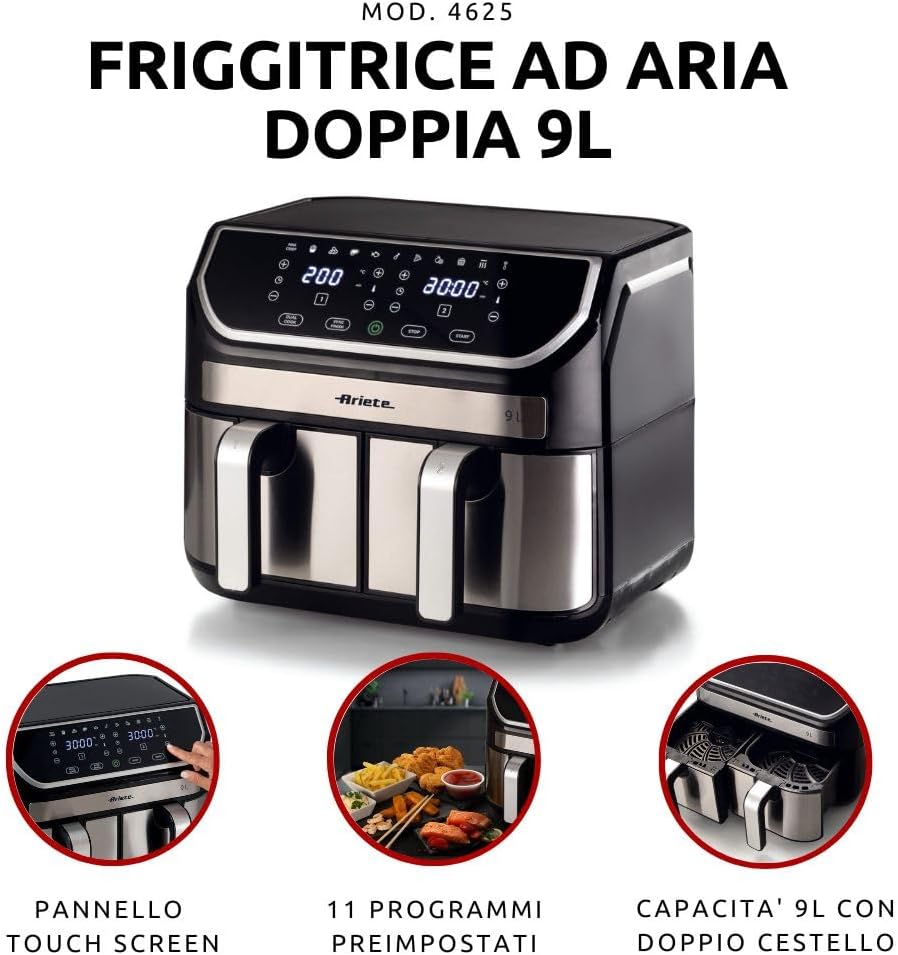 مدل 4625 از برند ایتالیایی آریته، یک سرخ کن بدون روغن با ظرفیت بالا، طراحی مدرن و نمایشگر دیجیتال است. این دستگاه دارای دو سبد مستقل با روکش نچسب و ظرفیت کلی ۹ لیتر میباشد. با ۱۱ برنامه پخت پیشفرض، فناوری گردش سریع هوای داغ (Rapid Air)، و امکان تنظیم دمای بین ۸۰ تا ۲۰۰ درجه سانتیگراد، میتوان انواع غذا را بهصورت کمچرب و سالم آماده کرد. سبدها قابل شستوشو در ماشین ظرفشویی بوده و طراحی دستگاه برای آشپزخانههای شلوغ و خانوادههای پرجمعیت بسیار مناسب است.