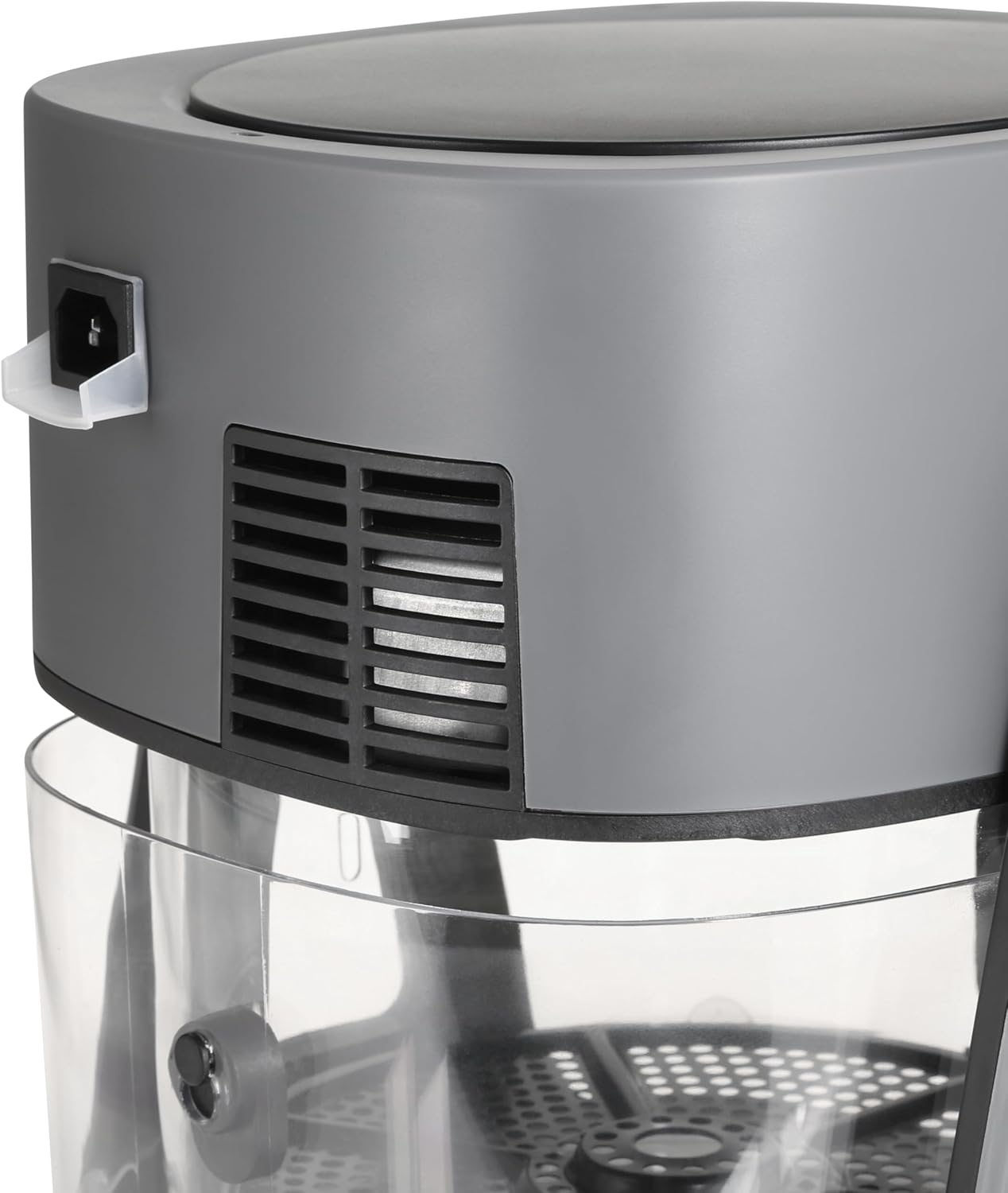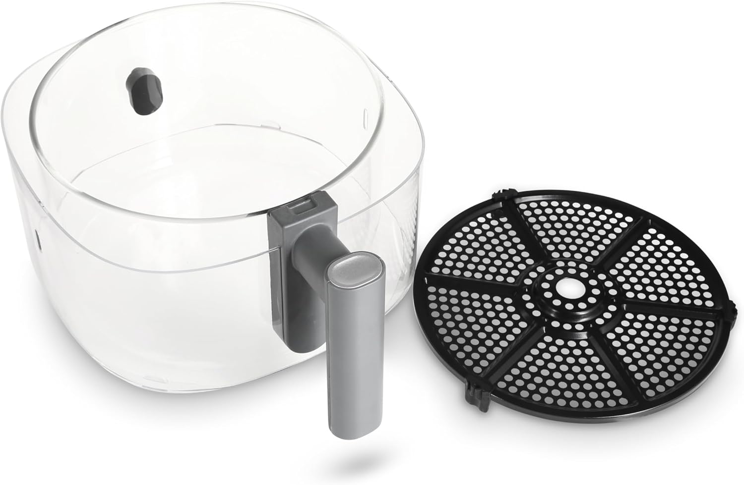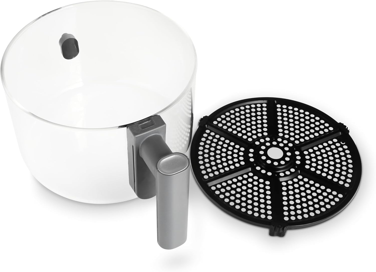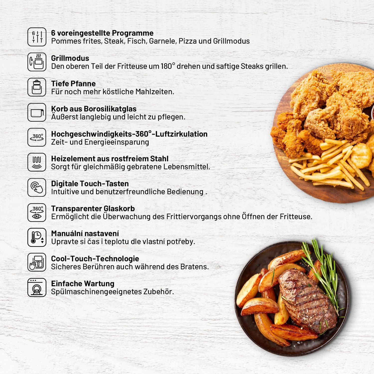 EINZIGARTIGER GLASKORB UND SICHERHEITSABDECKUNG - Der Frittierkorb aus Glas hat mehrere Vorteile. Absolute Unbedenklichkeit, da kein Nachgeschmack oder Geruch in den Lebensmitteln verbleibt, wie bei Teflon oder Aluminium. Außerdem haben Sie jederzeit einen Überblick über den Status des zubereiteten Gerichts. Der Frittierkorb aus Glas ist durch eine Sicherheitsabdeckung geschützt, um Verbrennungen zu vermeiden. 6 PROGRAMME - Wählen Sie intuitiv über das übersichtliche Digitaldisplay aus 6 voreingestellten Programmen zum Frittieren von Pommes frites, Fleisch oder zum Grillen - Fries, Steak, Fish, Shrimps, Pizza, Grill Mode - aus. Sie können die Zeit und die Temperaturen aber auch manuell einstellen. Dank des einzigartigen Glaskorbs mit 360°-Sicht und Innenbeleuchtung haben Sie den Garvorgang jederzeit im Blick. 3in1: HEIßLUFTFRITTEUSE, GRILL, BRATPFANNE - Die Heißluftfritteuse verfügt über eine einzigartige Technologie zur 180°-Drehung des oberen Teils, die zusammen mit der Verwendung der tiefen Pfanne oder der Grillpfanne die Möglichkeiten der Lebensmittelzubereitung erweitert. BIS ZU 80 % WENIGER FETT - Mit Hilfe der Hochgeschwindigkeits-360°-Luftzirkulation können Sie jedes Gericht, einschließlich Ihrer Lieblings-Bratkäse und Schnitzel, mit bis zu 80 % weniger Fett zubereiten. Infrarotlicht garantiert gleichmäßige Ergebnisse. VIDEO-TUTORIAL - Scannen Sie einfach den QR-Code auf dem Produkt, und ein Video-Tutorial wird angezeigt. Sie können es auch über einen Link auf der Verpackung oder in der Anleitung aufrufen. | قیمت یورویی : 119.99€