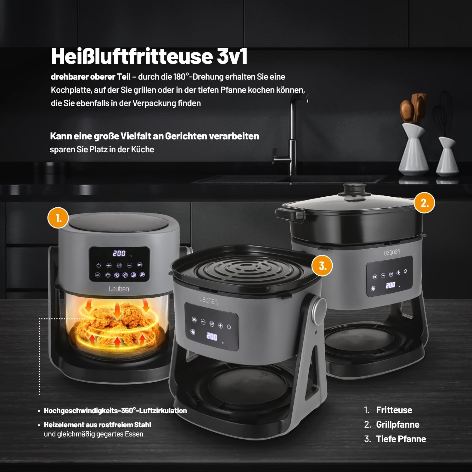 سرخ کن بدون روغن Lauben مدل Glass&Grill 3in15500BG با ظرفیت ۵.۵ لیتر، سبد سرخ کردن شیشهای، ۶ برنامه + تنظیم دستی، ۳ در ۱ - قابل استفاده به عنوان گریل و ماهیتابه، بدون PFOA