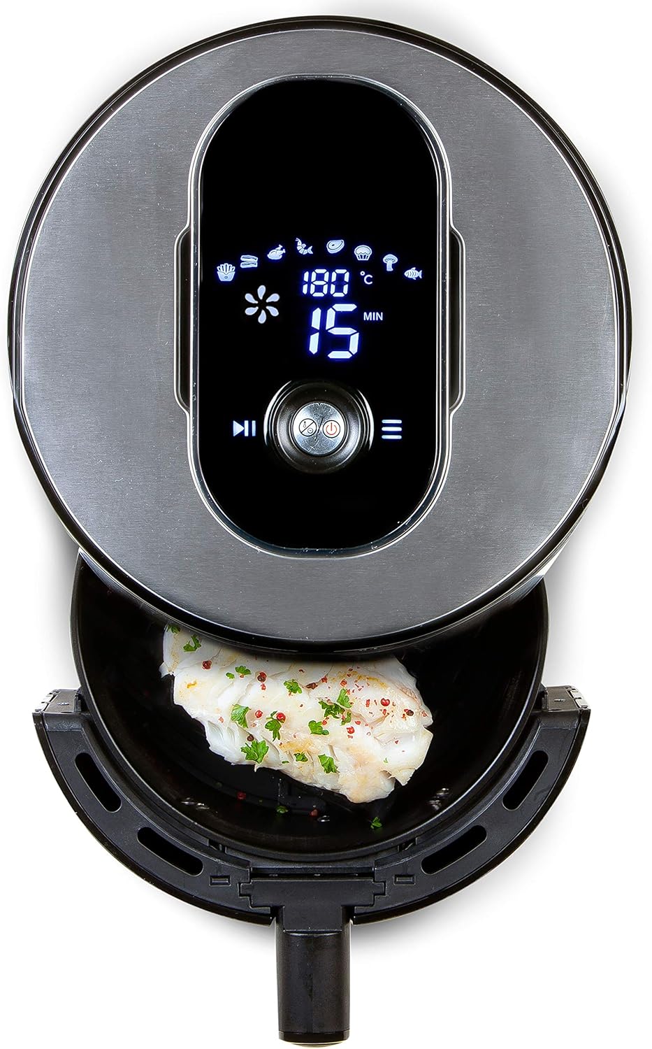 Heißluft-Fritteuse: bis zu 80% weniger Fett verglichen mit herkömmlichen Fritteusen Schnelle Luftzirkulation für zügiges, energiesparendes Frittieren Zur Zubereitung von Pommes Frittes, Kroketten und Snacks sowie Geflügel, Fleisch, Quiche, Kuchen u.v.m. Fassungsvermögen: 4 L - 1,2 kg Regulierbare Temperatur: 80°C-200˚C Timer bis 60 Minuten 8 automatische Programmen Frittierpfanne und Rost sind hochwertig antihaftbeschichtet Einfache Bedienung über das LCD Display Cool touch-Gehäuse in rostfreiem Edelstahl; 1500 W | قیمت یورویی : 70.94€