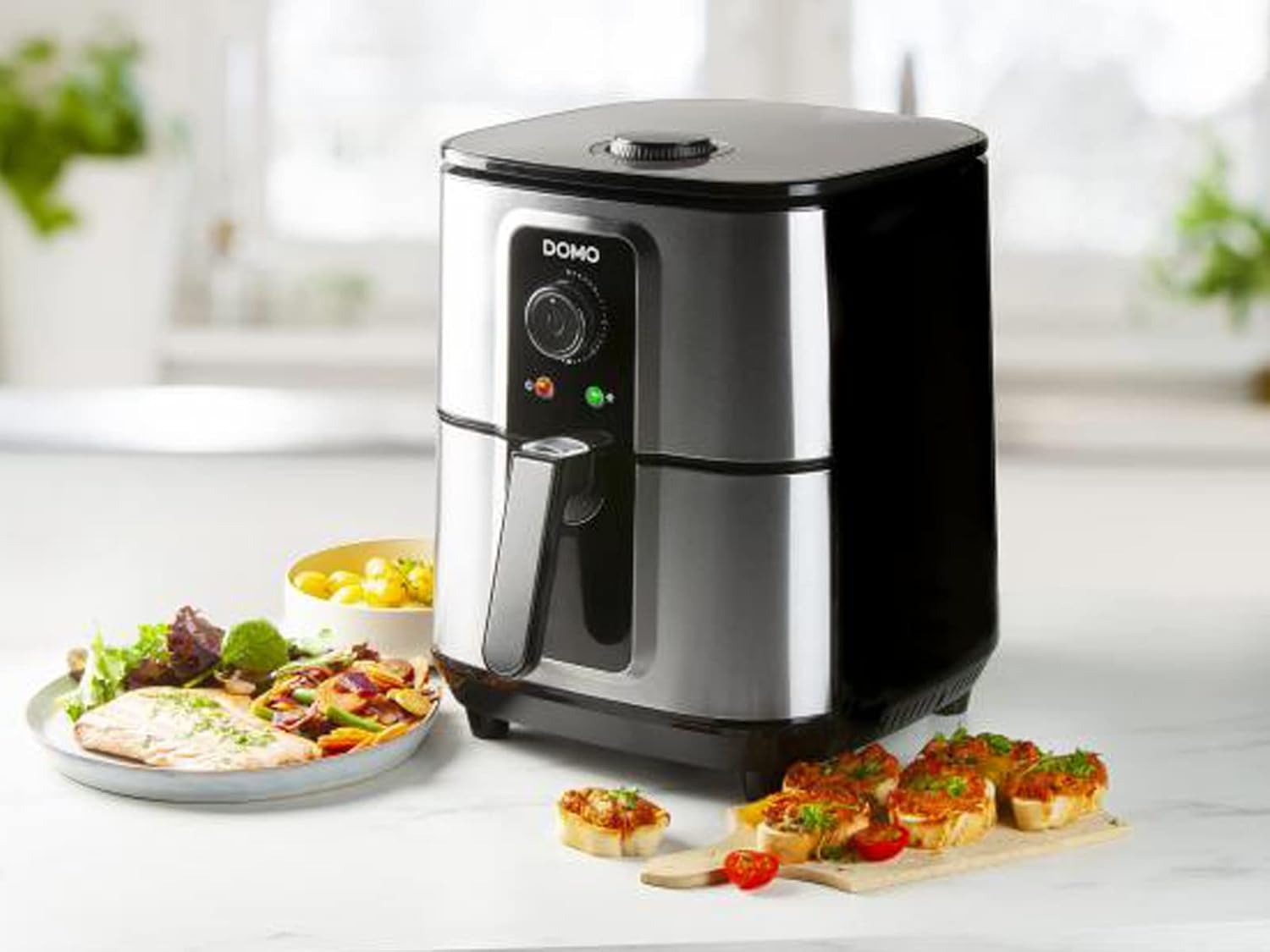 DOMO DO536FR Heißluft-Fritteuse Edelstahl 5,5 L لینک آمازون : https://www.amazon.de/dp/B09LQLWNTJ?th=1&psc=1 سرخکن هوای گرم: تا ۸۰٪ چربی کمتر در مقایسه با سرخکنهای معمولی گردش سریع هوا برای سرخ کردن سریع و صرفه جویی در مصرف انرژی برای تهیه سیب زمینی سرخ کرده، کروکت و تنقلات و همچنین مرغ، گوشت، کیش، کیک و موارد دیگر ظرفیت: ۵.۵ لیتر - ۱.۵ کیلوگرم دمای قابل تنظیم: 80 تا 200 درجه سانتیگراد تایمر تا 30 دقیقه ظرف و سبد سرخ کردن از جنس تفلون؛ ظرف قابل جدا شدن چراغهای نشانگر برای «روشن/خاموش» و «آماده»؛ کارکرد آسان بدنه و دستههای خنک ظرفیت ذخیرهسازی کابل؛ ۱۸۰۰ وات