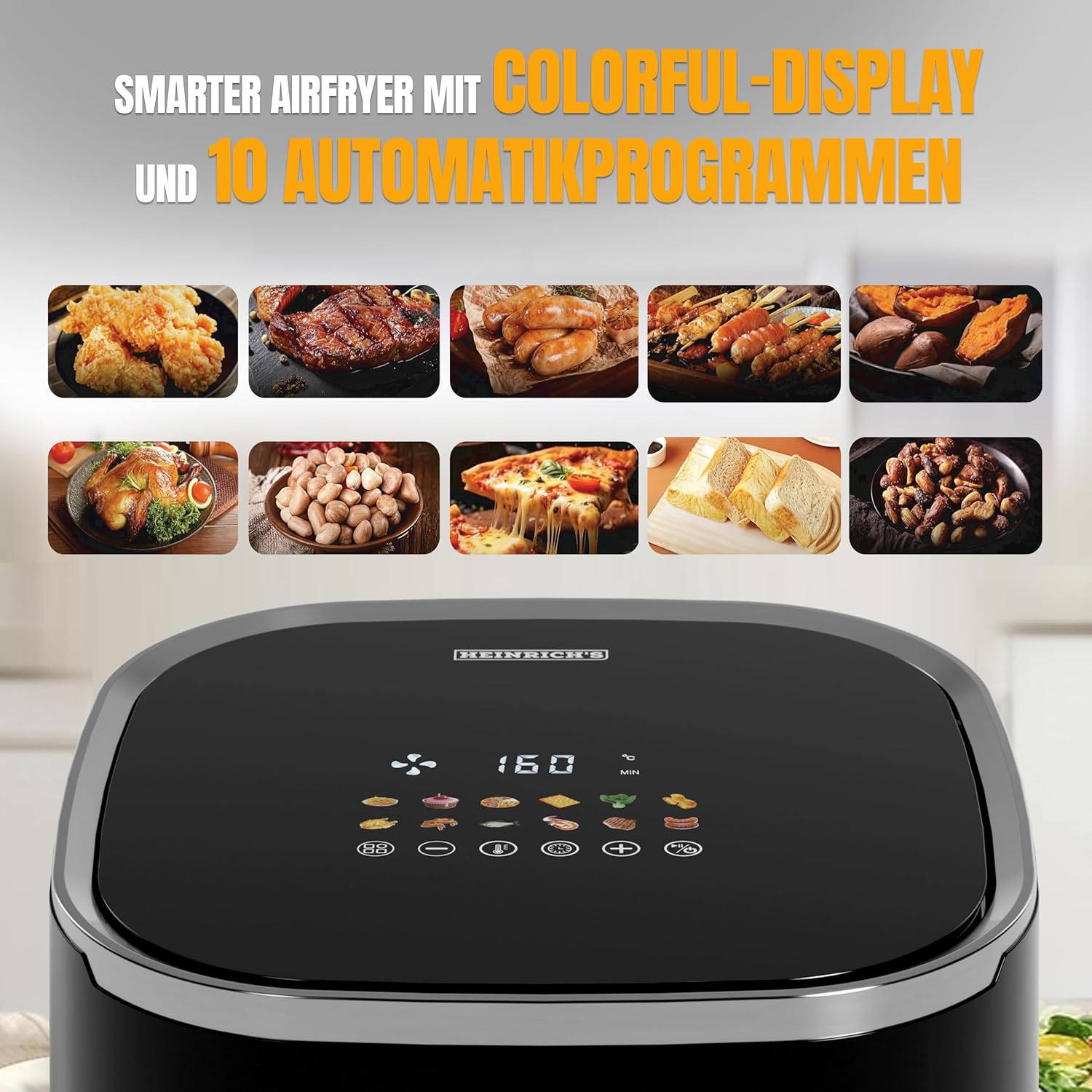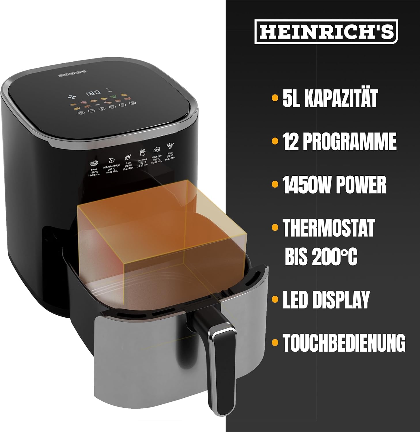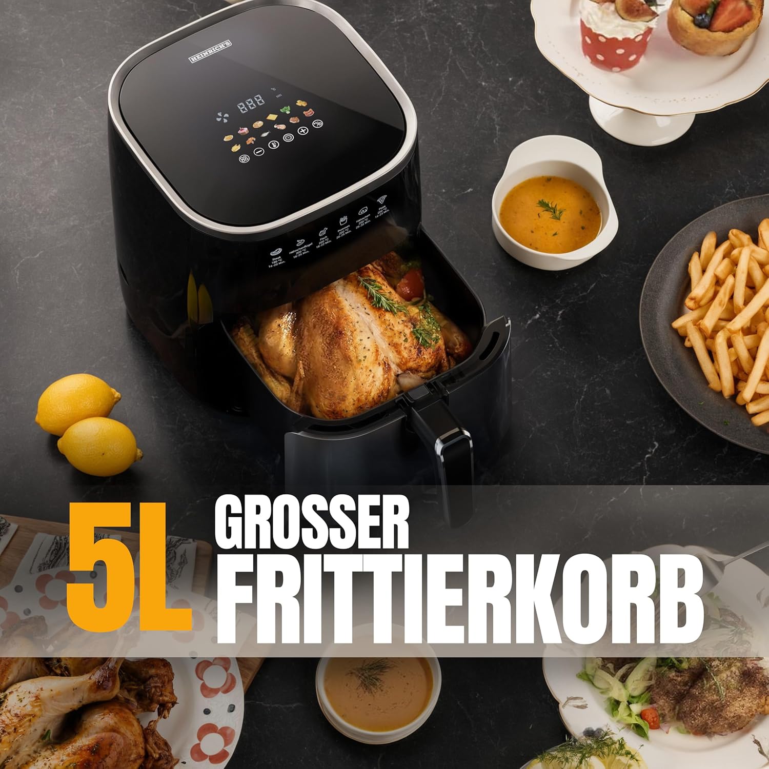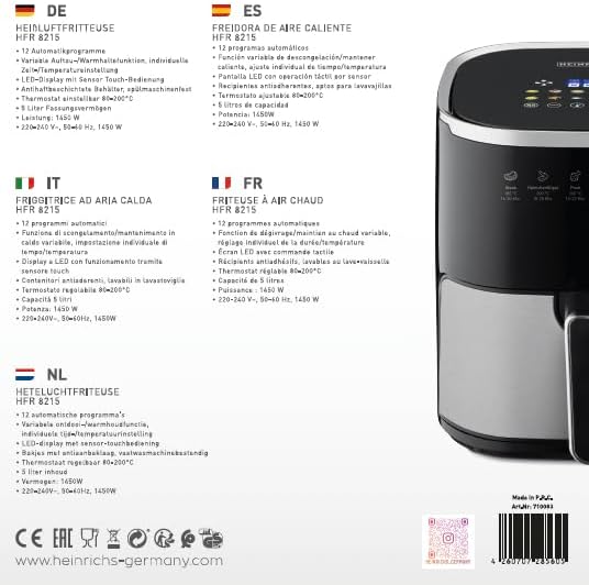 HEINRICHS Heißluftfritteuse, 5 Liter XL Air Fryer, 12in1 Heißluftfritteuse, LED-Display mit Sensor-Touch Bedienung, fettfreie Zubereitung, inkl. Timer, platzsparend, spülmaschinenfester Korb, 1450W 5L Touch | قیمت یورویی 69.99€