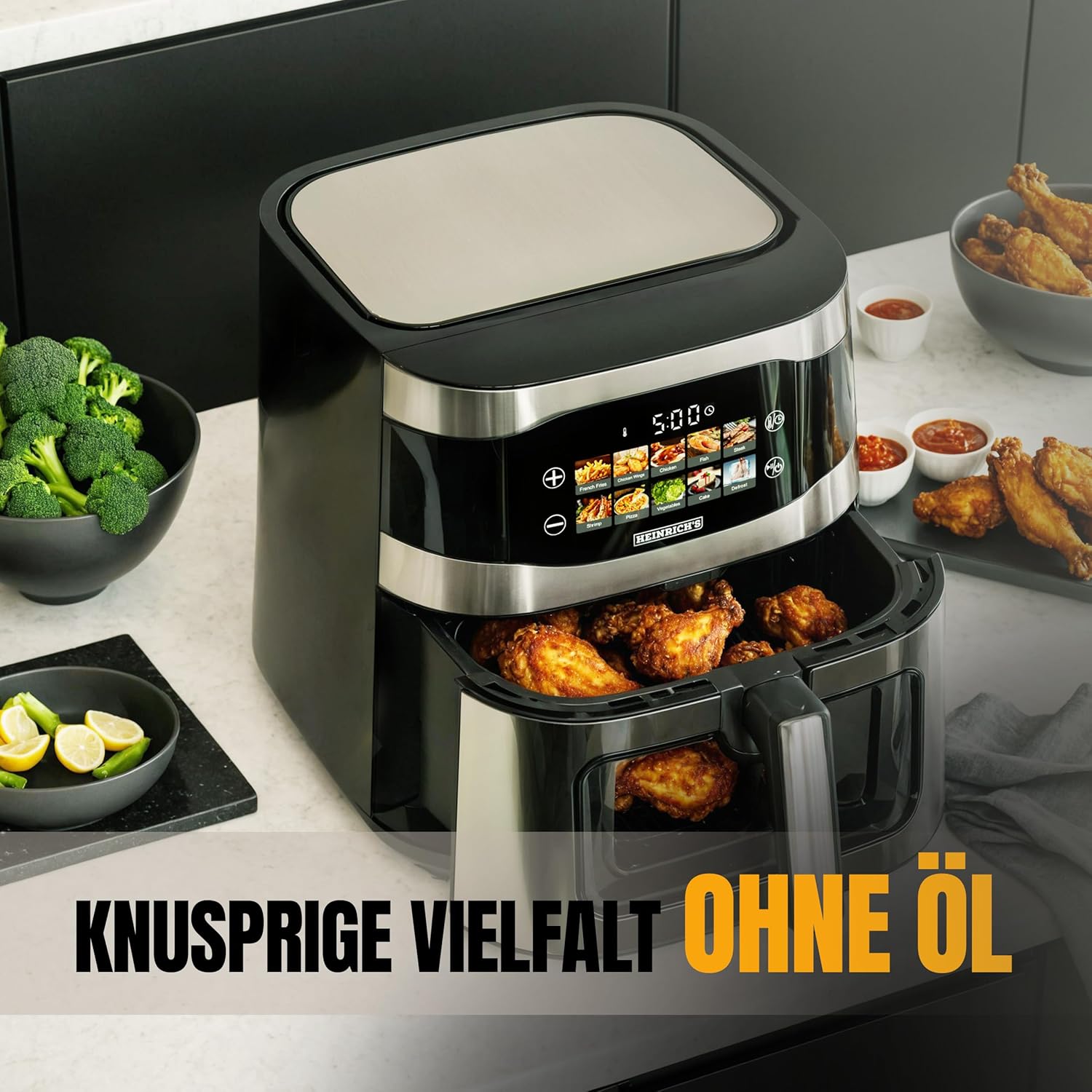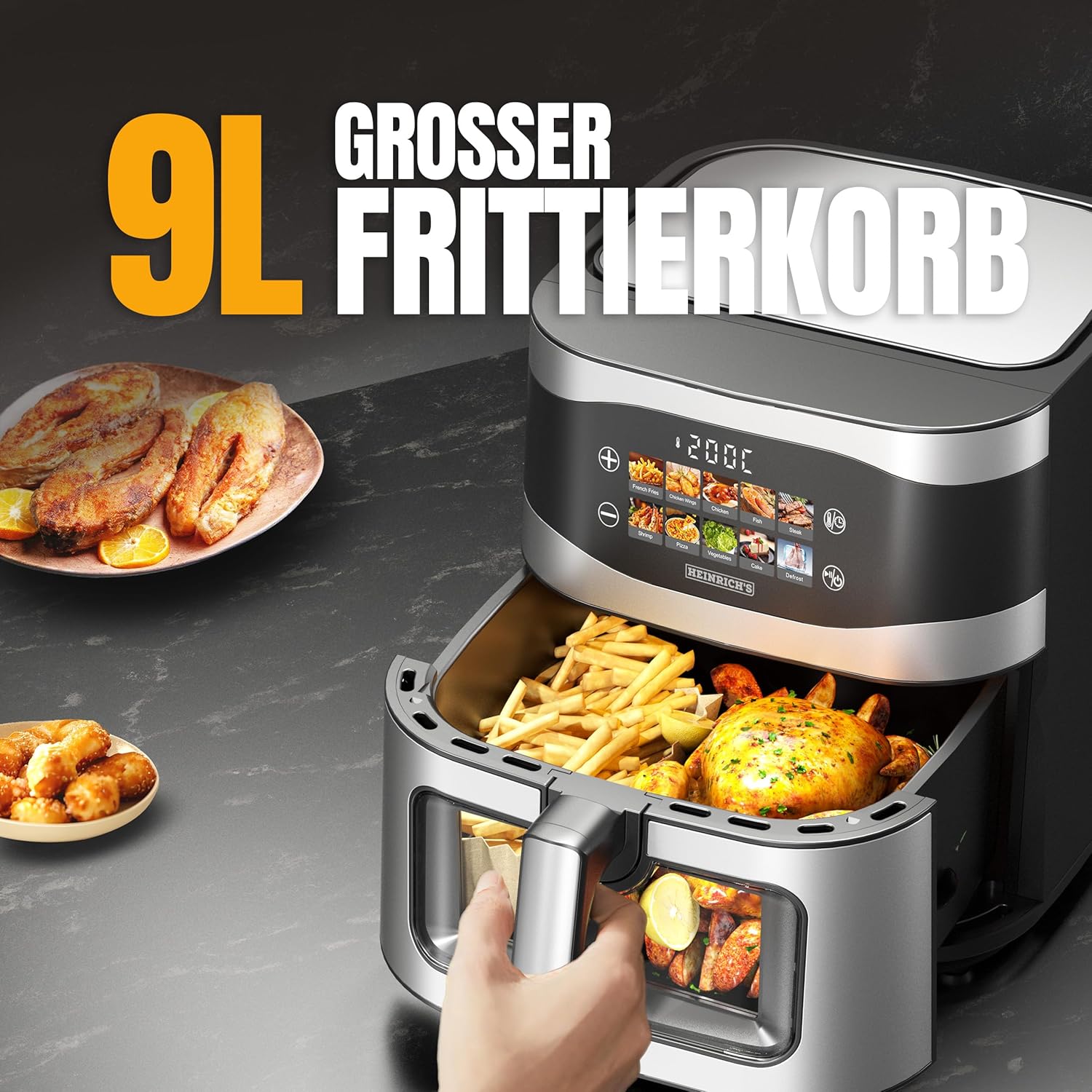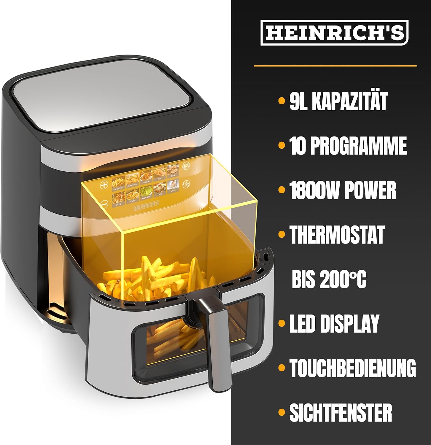 HEINRICHS Heißluftfritteuse, 9 Liter XXL Air Fryer, 10in1 Heißluftfritteuse, LED-Display mit Sensor-Touch Bedienung, fettfreie Zubereitung, inkl. Timer, platzsparend, spülmaschinenfester Korb, 1800W 9L Touch | قیمت یورویی 87.28€