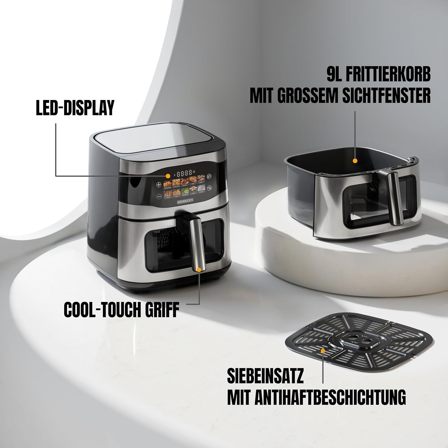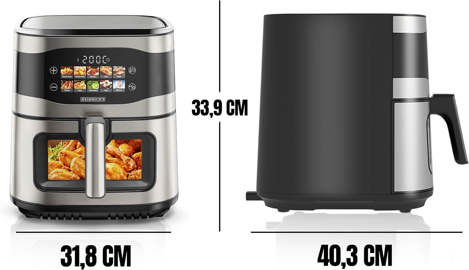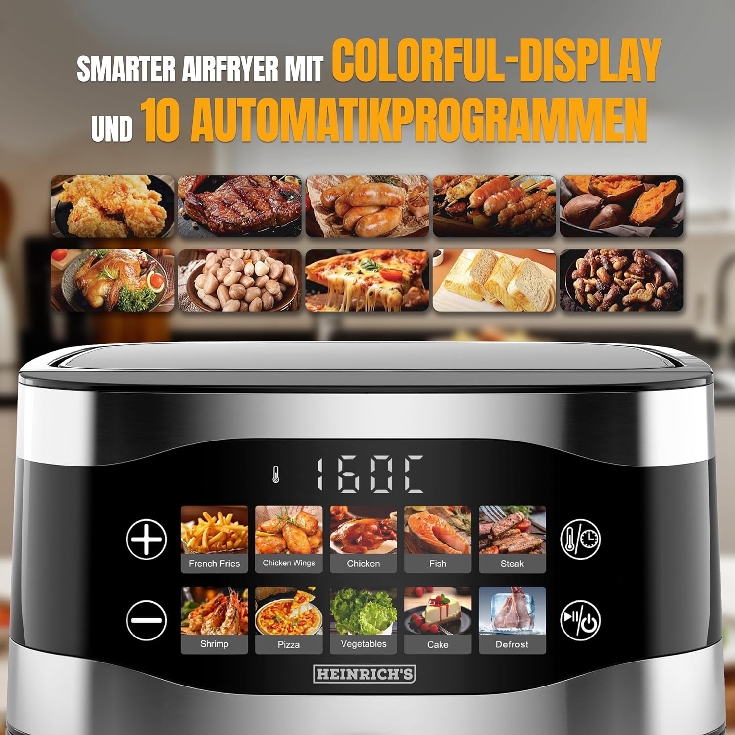 HEINRICHS Heißluftfritteuse, 9 Liter XXL Air Fryer, 10in1 Heißluftfritteuse, LED-Display mit Sensor-Touch Bedienung, fettfreie Zubereitung, inkl. Timer, platzsparend, spülmaschinenfester Korb, 1800W 9L Touch | قیمت یورویی 87.28€