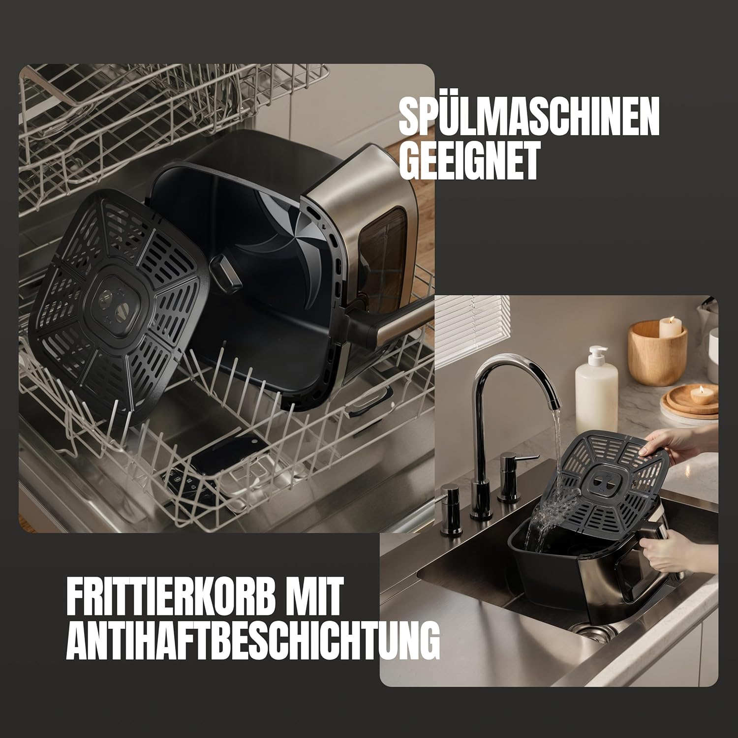 💪Leistungsstark und Flexibel : Mit 1800W Leistung liefert die Fritteuse in kurzer Zeit hohe Temperaturen und eine gleichmäßige Hitzeverteilung. Die Defrost-Funktion macht gefrorene Gerichte schnell einsatzbereit, damit Sie Zeit sparen und Ihre Gerichte direkt zubereiten können. Perfekt für Schnellrezepte oder spontane Mahlzeiten. 👍Individuell und Vielseitig: Mit 9 Litern Platz bereiten Sie problemlos Pommes, Gemüse oder ganze Gerichte für Familie und Freunde zu. 10 vordefinierte Automatikprogramme erzielen genau die richtige Temperatur und Zeit für gängige Gerichte – einfach wählen, starten und genießen. ✅Smart und Komfortabel: Das LED-Display mit Sensor-Touch-Bedienfeld macht die Bedienung übersichtlich und einfach. Die Temperatur ist individuell zwischen 80 bis 200°C einstellbar, dazu gibt es ebenfalls eine Timer-Funktion – perfekt, um knusprige Ergebnisse genau nach Wunsch zu erzielen, ohne ständig nach dem Essen schauen zu müssen. Optional können Sie Ihre Gerichte zusätzlich über das übersichtliche Sichtfenster beobachten. 🥦Praktisch und Gesund: Heißluft statt Fett – leckere, knusprige Snacks mit deutlich ganz ohne Öl. Der antihaftbeschichtete, spülmaschinenfeste Frittierkorb erleichtert Reinigung erheblich und sorgt dafür, dass Sie den Korb nicht mühsam per Hand reinigen müssen. 🎁Freude beim Verschenken: Überraschen Sie Ihre Liebsten mit unseren Produkten. Wir stehen Ihnen auch dort mit Rat und Tat zur Seite. | قیمت یورویی : 87.28€