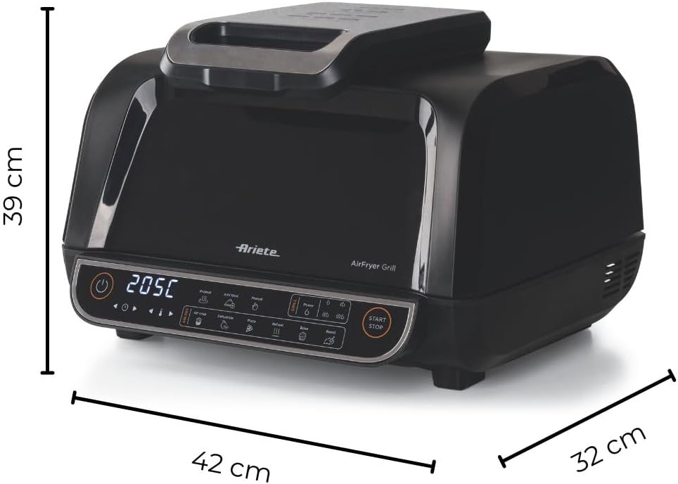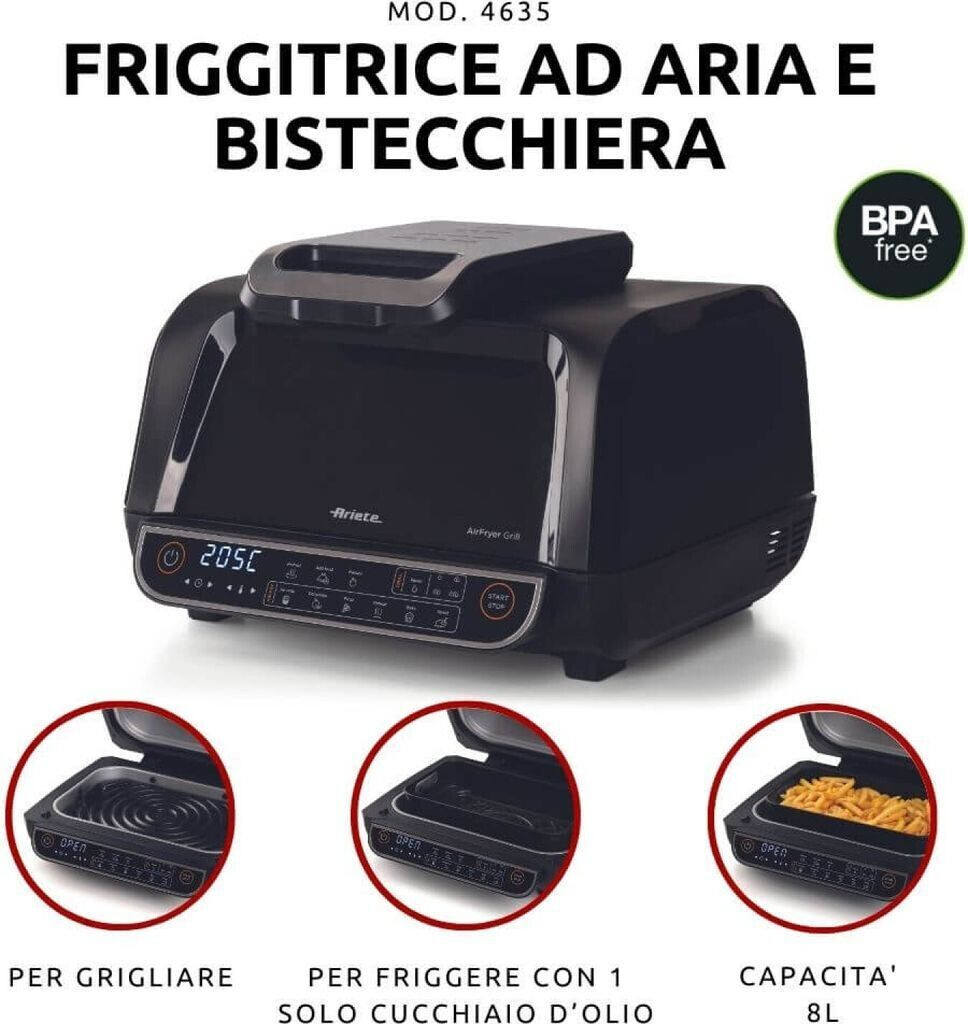 مدل 4635 از برند آریته، یک دستگاه ترکیبی از ایر فرایر و گریل است که برای تهیه غذاهای متنوع با حداقل مصرف روغن طراحی شده است. این دستگاه دارای ظرفیت ۸ لیتر، توان ۱۷۰۰ وات، ۸ عملکرد خودکار و سبد گریل جداشونده است. کنترل دما، تایمر، و طراحی مدرن مشکی آن را برای آشپزخانههای امروزی مناسب کرده است. با گردش هوای داغ، پخت یکنواخت و سالمتری نسبت به روشهای سنتی فراهم میشود.