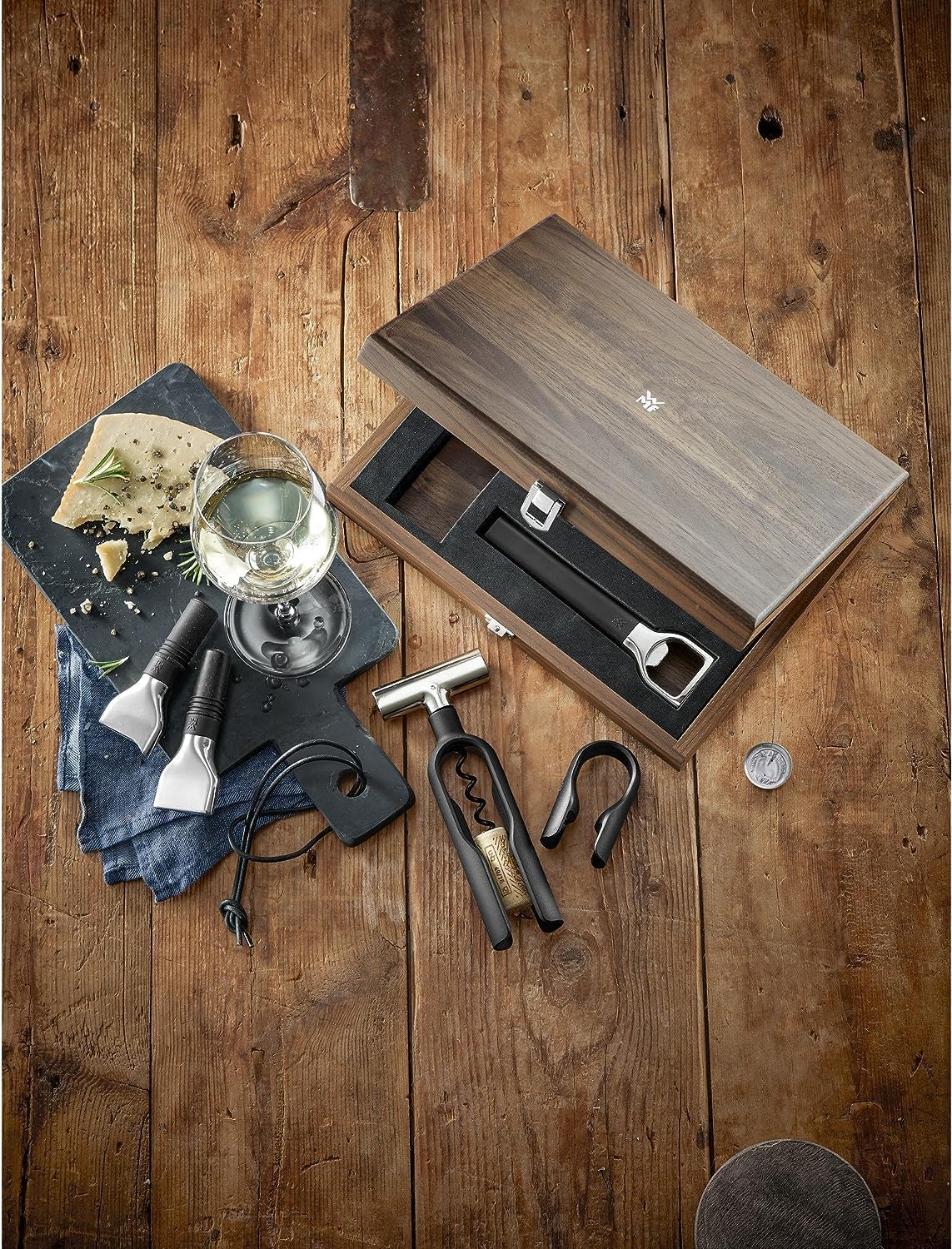 WMF Baric Wein Sommelier Set 5-teilig, Wein Zubehör, Korkenzieher, Folienschneider, Flaschenverschluss, Weinausgießer, Flaschenöffner, in Walnussholzbox, schwarz 5-teilig Schwarz | قیمت یورویی 89.99€