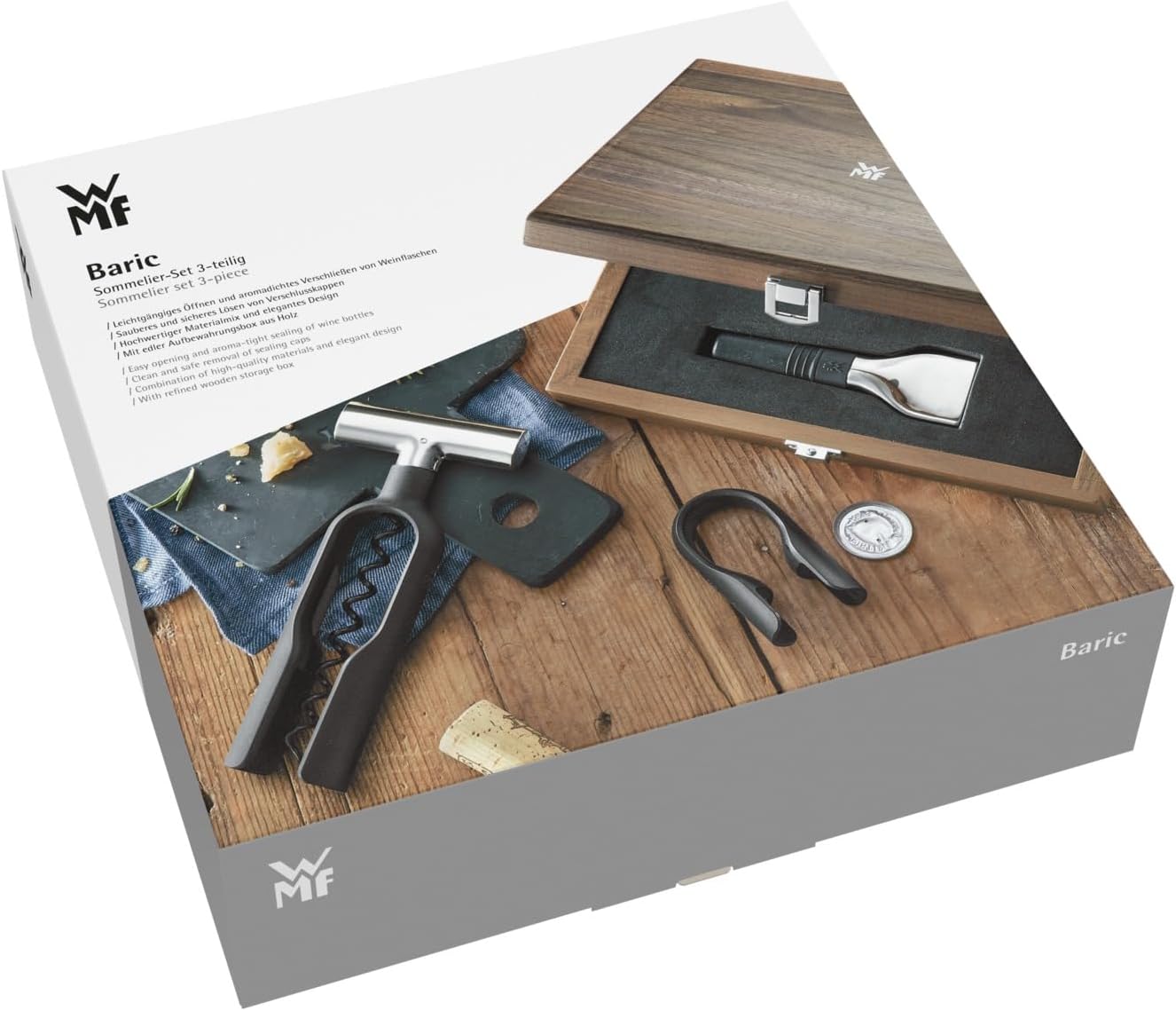 WMF Baric Wein Sommelier Set 3-teilig, Korkenzieher Set, Wein Zubehör, Folienschneider, Flaschenverschluss, in Walnussholzbox, schwarz Single | قیمت یورویی 54.99€