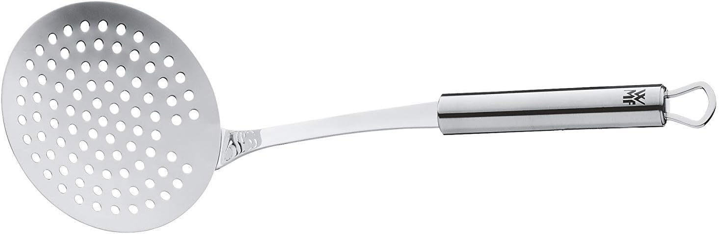 WMF Profi Plus Küchenhelfer Set 6-teilig, Hängeleiste mit 5 Helfer, Schöpflöffel, Schaumlöffel, Saucenlöffel, Wender, Fleischgabel, Kelle, Cromargan Edelstahl teilmattiert, spülmaschinengeeignet Single لینک آمازون : https://www.amazon.de/dp/B000WGMQWW?th=1&psc=1 محتویات: ۱ عدد میله آویز (طول ۳۵ سانتیمتر)، ۱ عدد ملاقه ۳۰ سانتیمتر، ۱ عدد کفگیر ۳۰ سانتیمتر، ۱ عدد ملاقه سس ۲۷ سانتیمتر، ۱ عدد کفگیر ۳۲.۲ سانتیمتر، ۱ عدد چنگال گوشت ۳۲ سانتیمتر - شماره کالا: ۱۸۷۱۵۲۹۹۹۰ جنس: استیل ضد زنگ Cromargan® 18/10، روکش نیمه مات. ضد زنگ، قابل شستشو در ماشین ظرفشویی، دارای ثبات ابعادی، بهداشتی، مقاوم در برابر اسید و عملاً غیر قابل خراب شدن. قطعات کاربردی اسکیمر محکم به دسته متصل شدهاند. این اسکیمر دارای یک روزنه کاربردی برای نگهداری روی ریل آویز با قلاب است. سرویس ظروف آشپزخانه ۵ تکه روی ریل آویز شامل بسیاری از وسایلی است که در یک آشپزخانه مجهز ضروری هستند. ملاقه، کفگیر، ملاقه سس، کفگیر و چنگال گوشت همه کاره هستند و به طور مرتب روی ریل آویزان قرار میگیرند و همیشه در دسترس هستند.