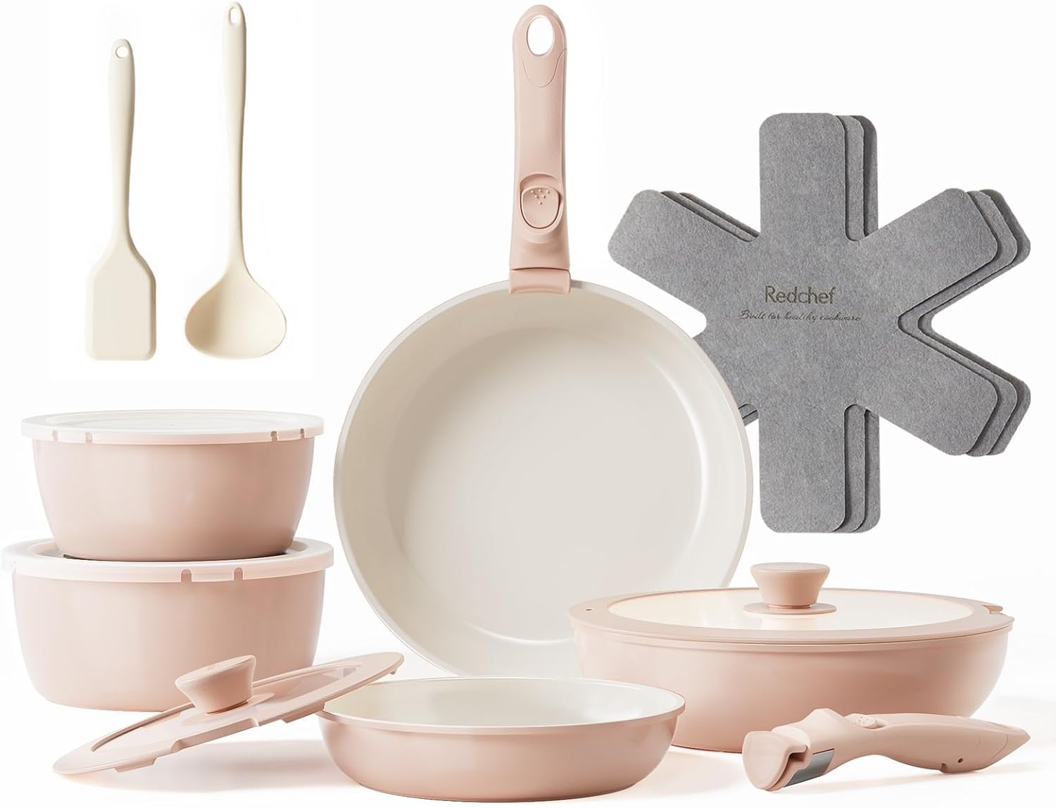 سرویس ظروف سرامیکی نچسب 16 تکه Redchef با دسته قابل جابجایی، ماهی تابه 20/26 سانتی متر، ماهیتابه عمیق 26 سانتی متر، قابلمه 18/20 سانتی متر، ست ظروف قابل روی هم برای همه اجاق ها، اجاق گاز، صورتی