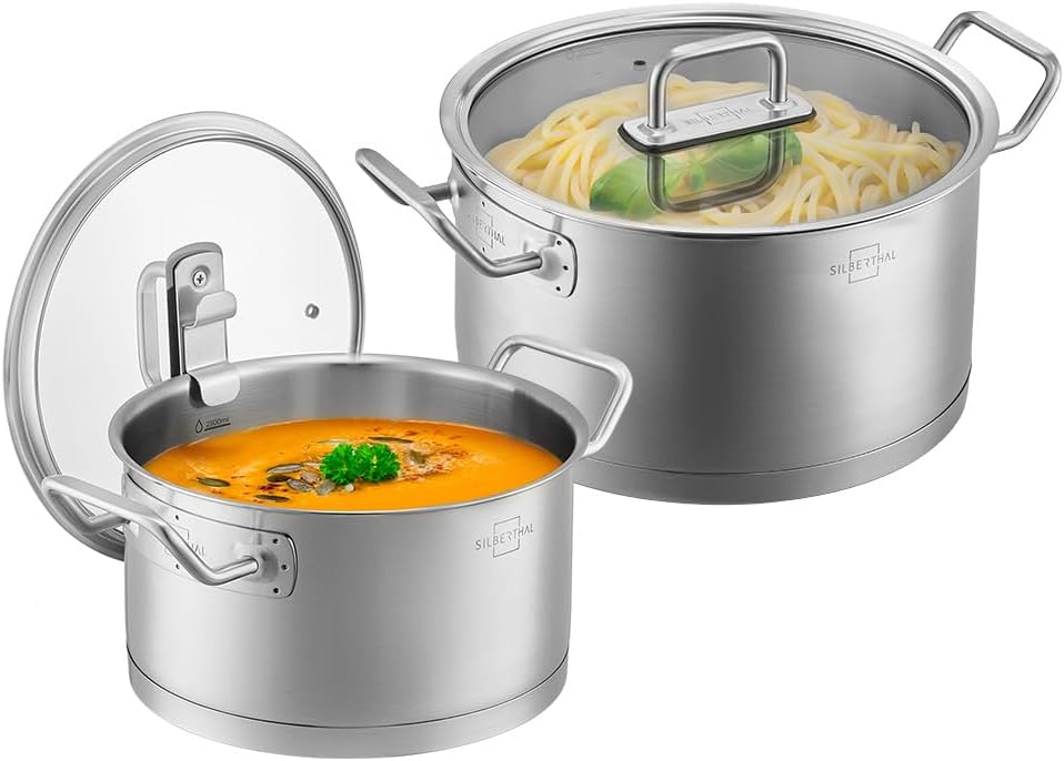 سرویس قابلمه استیل ضد زنگ سیلبرتال، 2 تکه - قابلمههای 3.5 و 5 لیتری، مناسب برای همه اجاق گازها از جمله اجاق القایی و فر - قابلمههای با درب شیشهای - قابل شستشو در ماشین ظرفشویی، سرویس 2 تکه