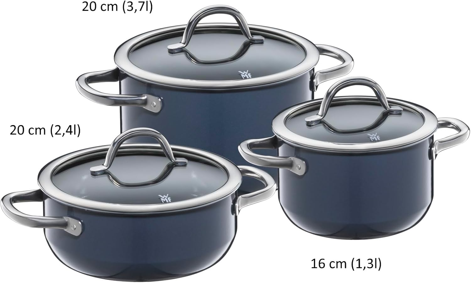 سرویس قابلمه القایی 3 تکه WMF Fusiontec Inspire، سرویس قابلمه با درب شیشهای، قابلمههای سازگار با اجاق القایی، سرامیک پیشرفته، مقاوم در برابر خراش، بدون پوشش، بدون علامت اندازهگیری، آبی تیره، ساخت آلمان