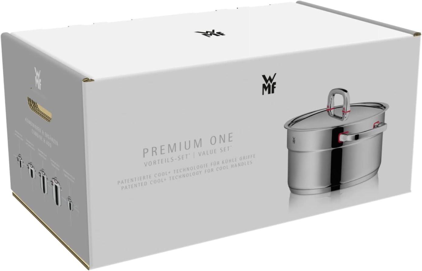 سرویس قابلمه القایی 5 تکه WMF Premium One، سرویس قابلمه با درب فلزی، استیل ضد زنگ Cromargan براق، سرویس قابلمه القایی بدون پوشش، قابلیت شستشو با بخار داخلی، مناسب برای انواع اجاق گاز، مناسب برای فر