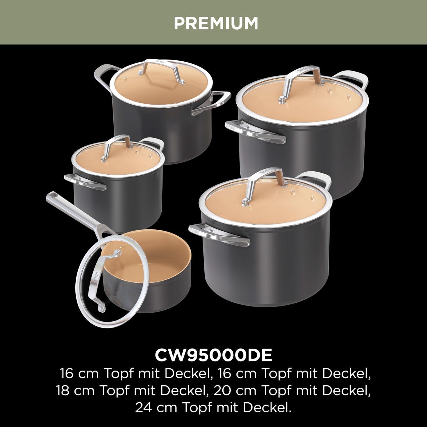 Ninja Extended Life 5-teiliges Keramik-Kochset (20 & 24cm Bratpfannen, 16, 18 & 20cm Kochtopf), antihaftbeschichtet (ohne PFAs, PFOAs, Blei, Cadmium), Ofenfest bis 285 °C, Terrakotta & Grau, CW95000DE | قیمت یورویی 139€