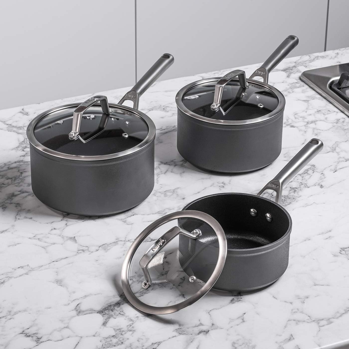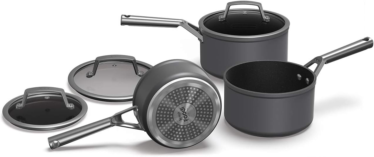 Ninja Foodi ZEROSTICK 3-teiliges Kochtopfset mit Glasdeckeln, langlebige Antihaftbeschichtung, hart eloxiertes Aluminium, backofen- und spülmaschinenfest, Induktionskompatibel, Grau, C33000EU 3-teiliges Topfset | قیمت یورویی 135€