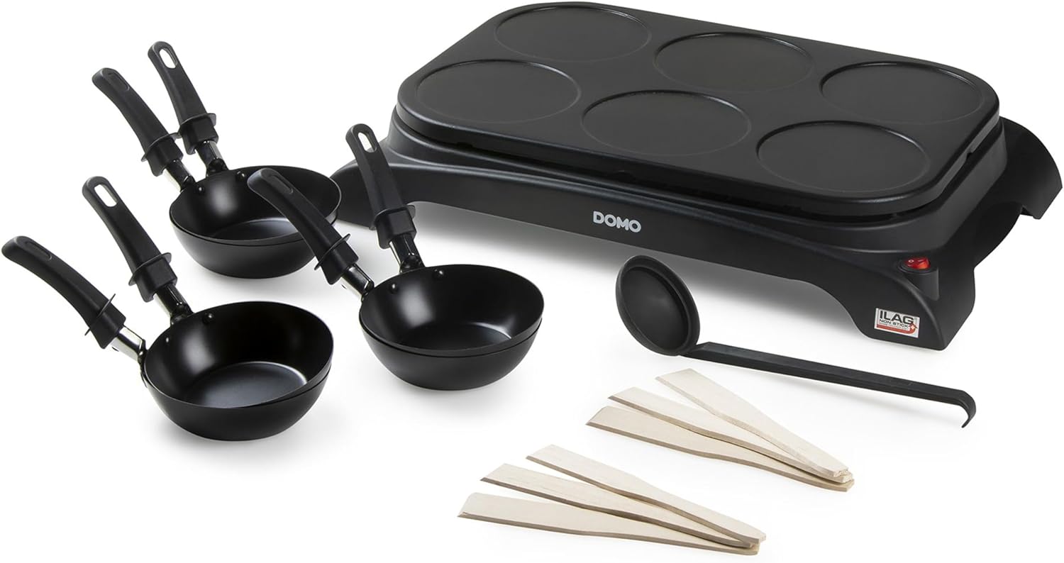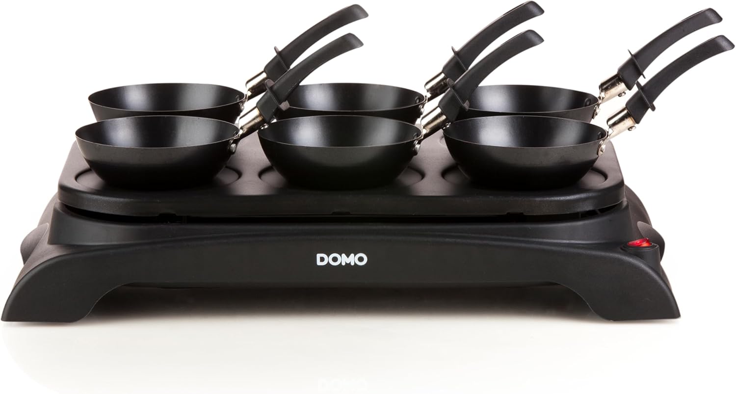EMEINSAM GENIESSEN MIT BIS ZU 6 PERSONEN - Jeder bereitet sein Lieblingsgericht direkt am Tisch in einem eigenen Wokpfännchen zu 2-IN-1 WOK UND PFANNKUCHENPLATTE - Flexibler Einsatz für herzhafte und süße Speisen mit der DOMO Gourmetset SCHNELLES AUFHEIZEN DANK 1000 WATT - Sofort einsatzbereit für spontane Abende mit Freunden oder Familie INKLUSIVE 6 WOK-PFÄNNCHEN UND HOLZSPATEL - Ideal zum Braten, Woken und kreativen Kombinieren am Tisch MINI-PFANNKUCHEN FÜR DEN PERFEKTEN ABSCHLUSS - Sechs kleine Pfannkuchen gleichzeitig backen mit beiliegendem Messlöffel RACLETT-GRILL FÜR JEDEN ANLASS - Ob Geburtstag, Feiertag oder gemütliches Beisammensein – diese Raclette-Set passt immer ANTIHAFTBESCHICHTUNG FÜR EINFACHE REINIGUNG - Wok und Grillplatte sind leicht sauber zu halten EINFACHE BEDIENUNG UND KONTROLLLEUCHTE - Ein-/Ausschalter mit Leuchte für maximale Kontrolle | قیمت یورویی : 65.99€