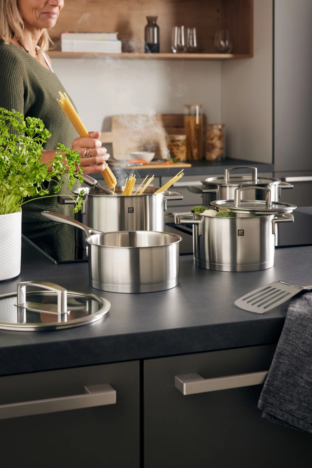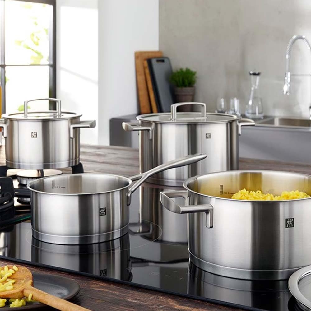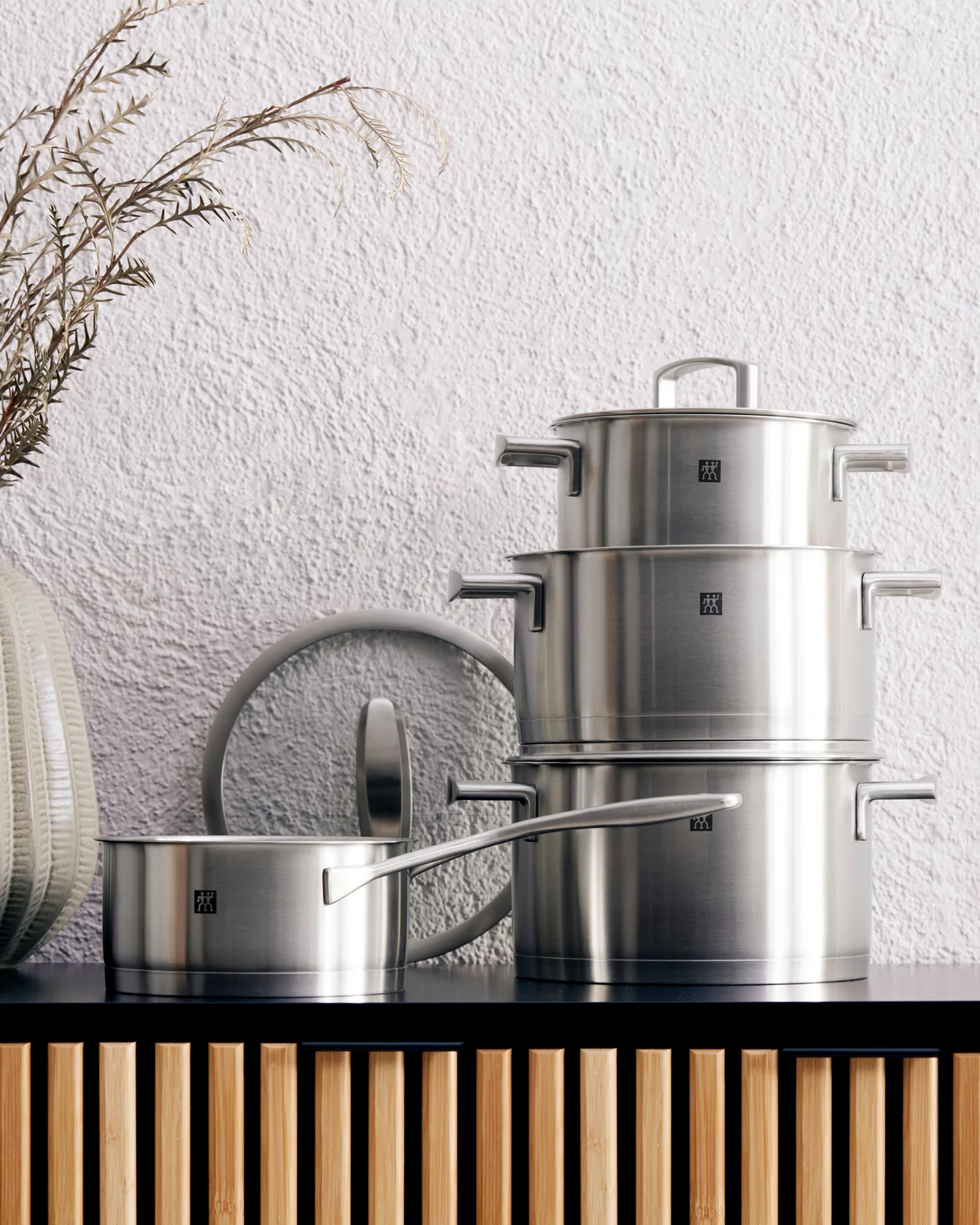 سرویس قابلمه 4 پارچه zwilling Vitality از استیل ضد زنگ با طراحی مدرن ساخته شده است. این سرویس دارای پایه چندلایه برای توزیع یکنواخت حرارت، دربهای استیل مقاوم و دستههای ارگونومیک است. مناسب برای انواع اجاقها و قابل شستشو در ماشین ظرفشویی.