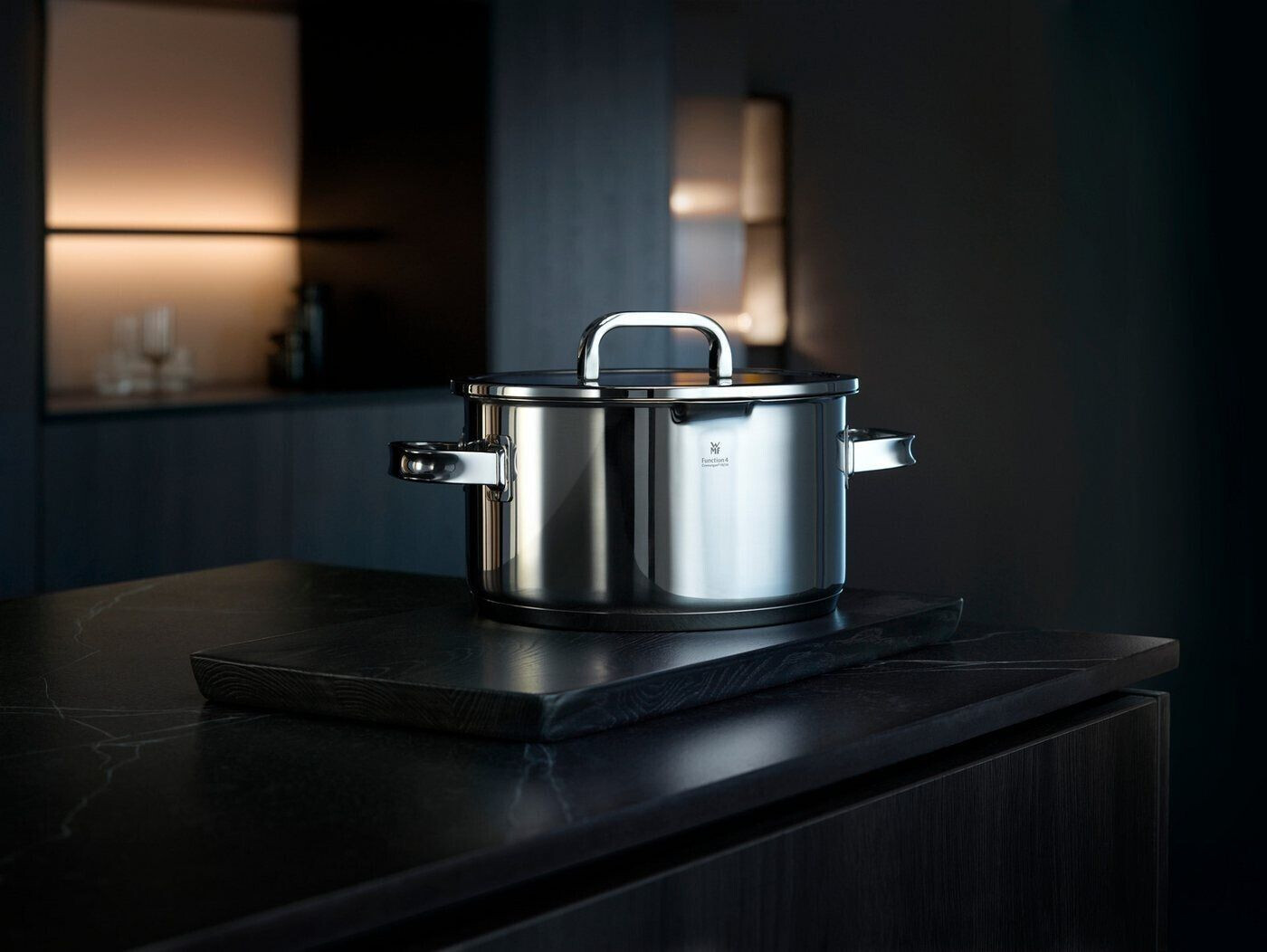 سرویس قابلمه 4 پارچه WMF Function 4 Black با طراحی مدرن و کیفیت بالا، انتخابی ایدهآل برای آشپزخانههای حرفهای و خانگی است. این مجموعه از استیل ضد زنگ Cromargan® 18/10 ساخته شده که دوام و مقاومت بالایی در برابر خط و خش، زنگزدگی و تغییر رنگ دارد. دربهای شیشهای این قابلمهها دارای حلقه سیلیکونی مشکی و سیستم خروج بخار قابل تنظیم در چهار حالت مختلف هستند که امکان کنترل دقیق بخار و آبکشی آسان را فراهم میکنند.