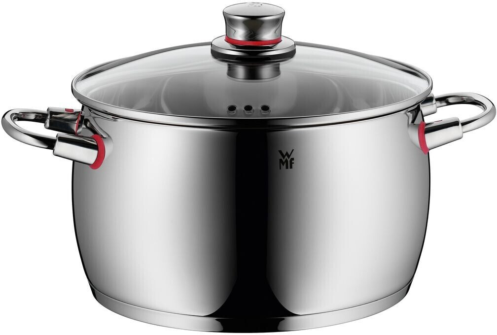 سرویس قابلمه 5 پارچه WMF Quality One، ساختهشده از استیل ضد زنگ 18/10 Cromargan®، دارای کفه TransTherm برای توزیع یکنواخت حرارت، دربهای شیشهای مقاوم به حرارت با خروجی بخار، مناسب برای انواع اجاقها