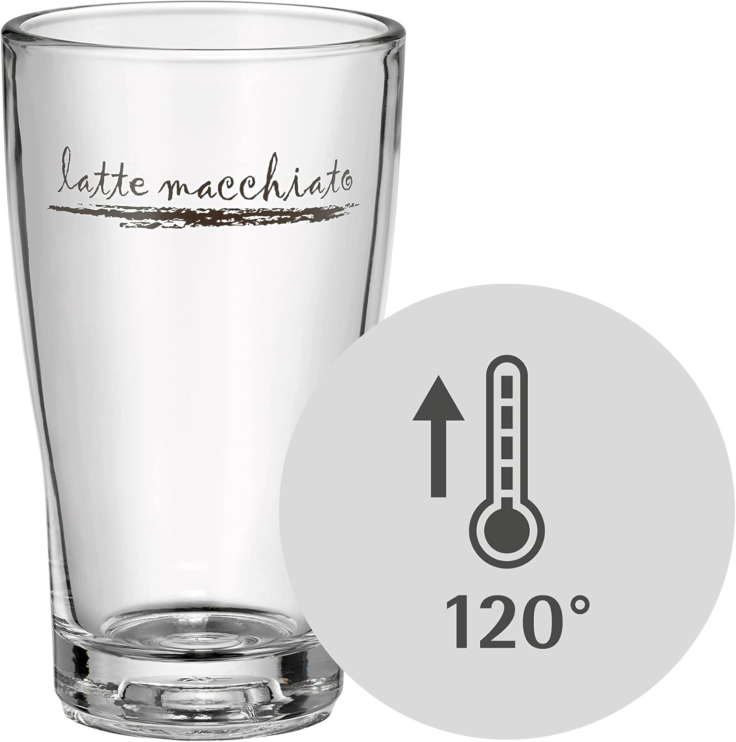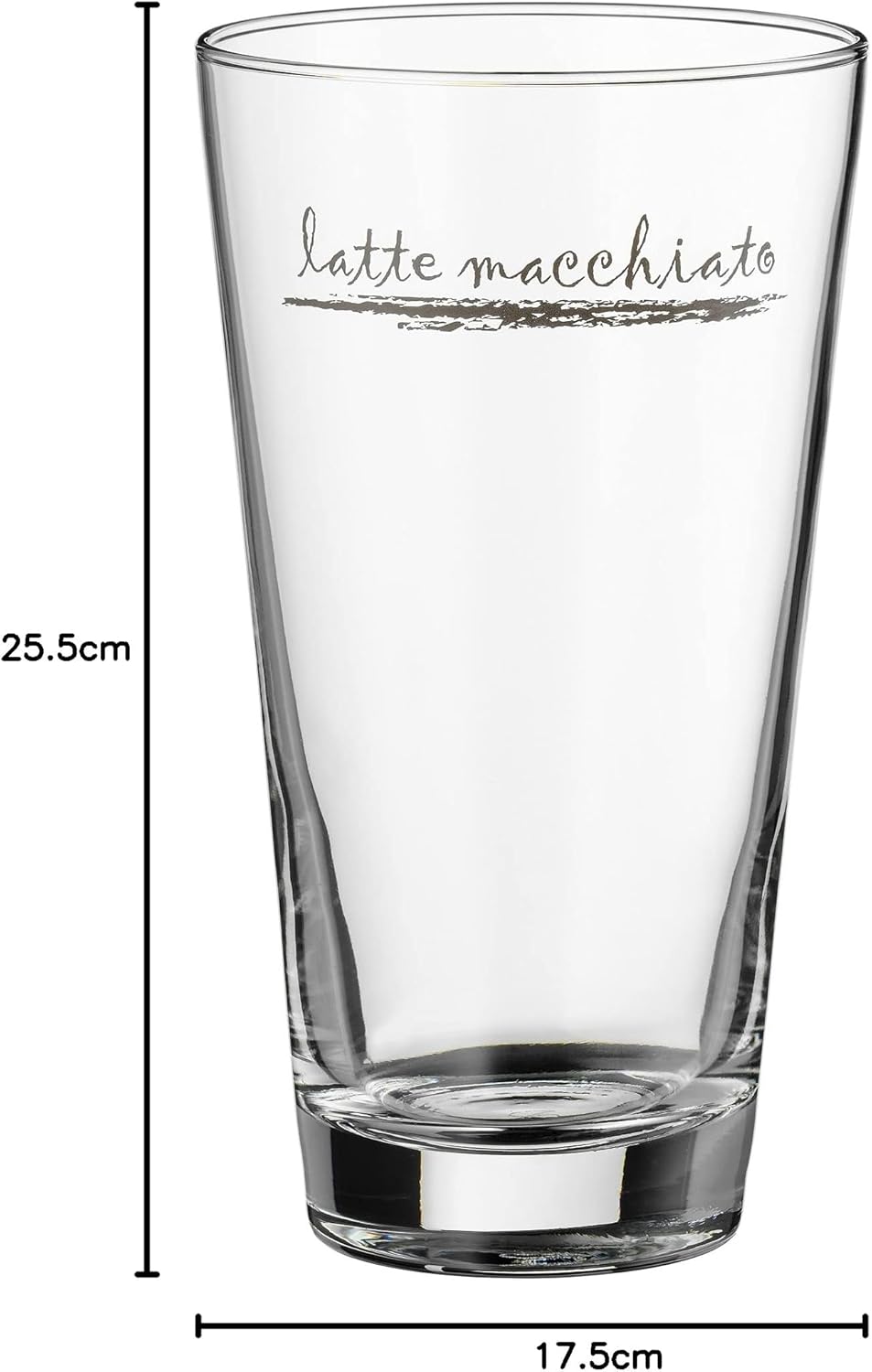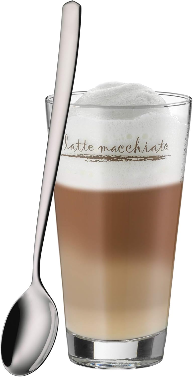 Inhalt: 6x Latte Macchiato-Gläser mit Aufdruck (Volumen 280 ml, Höhe 13 cm, Bodendurchmesser 5,1 cm), 6x Latte Macchiato Löffel (Länge 18,5 cm) - Artikelnummer: 0996269999 Material: Kaffeegläser: hitzebestäniges Glas - spülmaschinengeeignet. Löffel: Cromargan Edelstahl 18/10, poliert - rostfrei, spülmaschinengeeignet, formstabil, hygienisch, säurefest und unverwüstlich Die Gläser verfügen über eine dicke Wandung am Boden. So kann die Temperatur optimal gehalten und die Gläser problemlos angefasst werden. Die Gläser eignen sich auch als Eiskaffee Gläser Das Latte Macchiato Glas ist mit dem Schriftzug „Latte Macchiato“ bedruckt. Durch die offene Form bleibt der Milchschaum standhaft und die Schichtung hebt sich optimal hervor Die Gläser sind stapelbar und platzsparend im Schrank . Die Löffel sind extra lang, so dass man ohne Probleme, ganz bequem den Latte Macchiato umrühren kann | قیمت یورویی : 33.78€