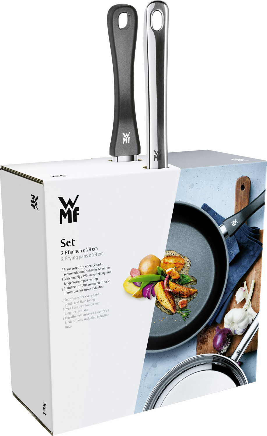 سرویس ماهیتابه WMF Pfannen-Starter شامل دو عدد تابه در سایز ۲۸ سانتیمتر، ساختهشده از استیل ضدزنگ Cromargan® 18/10 با پوشش نچسب باکیفیت، کف TransTherm® برای پخش یکنواخت حرارت، مناسب برای تمامی اجاقها از جمله القایی.