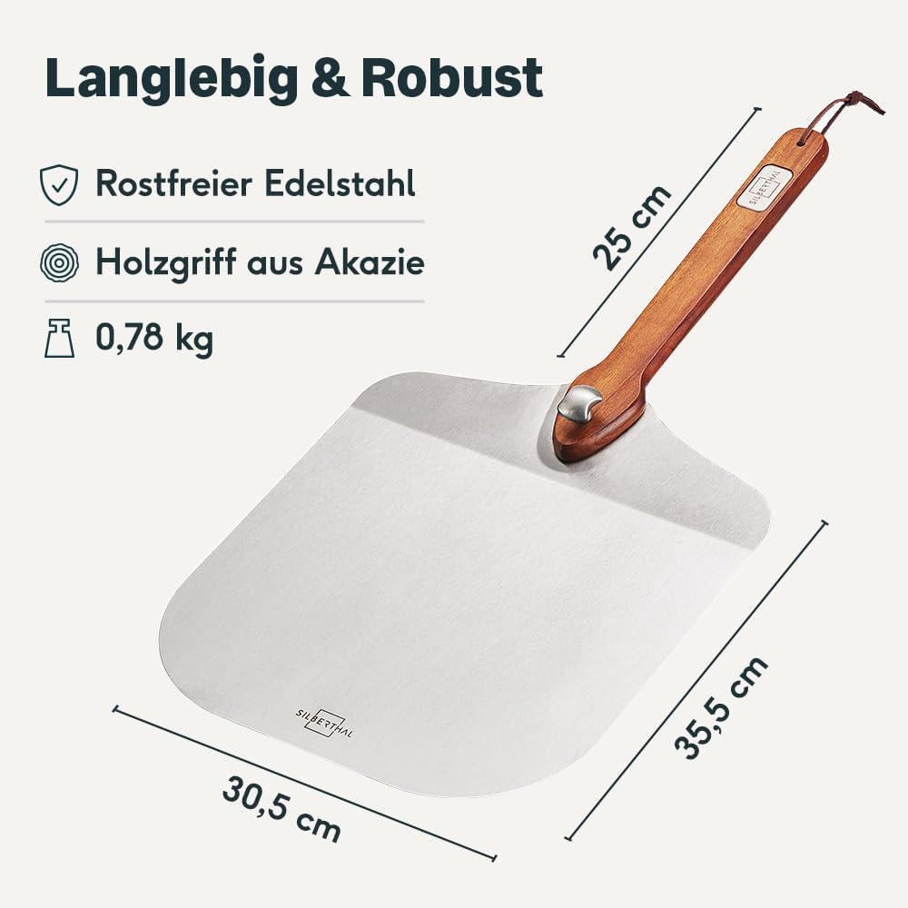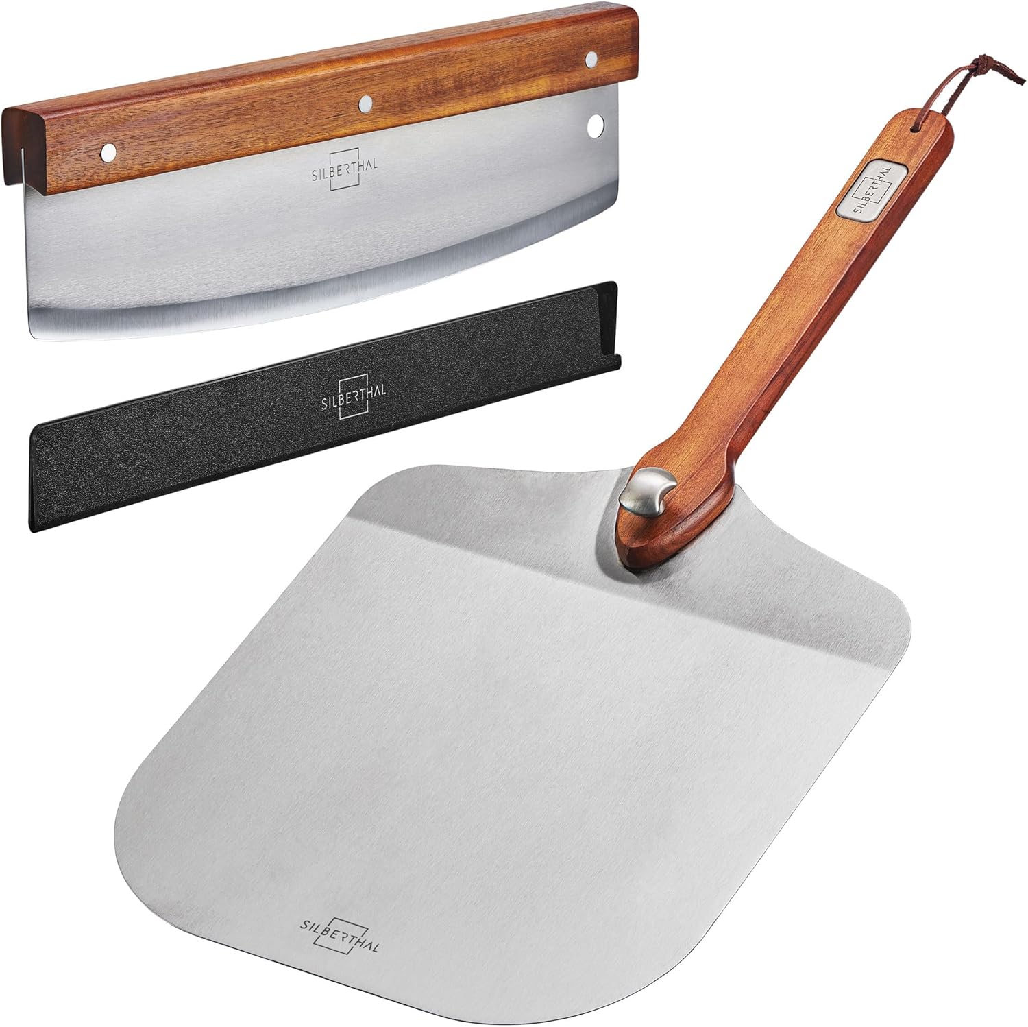 SILBERTHAL Pizzaschieber Set 30cm 2tlg - Mit Profi Pizzaschneider - Zubehör Set aus Edelstahl mit Akazienholz - Ideal für Pizza, Brote und Kuchen im Heimofen - Spülmaschinenfest Pizzaschieber + Messer Set | قیمت یورویی 44.95€