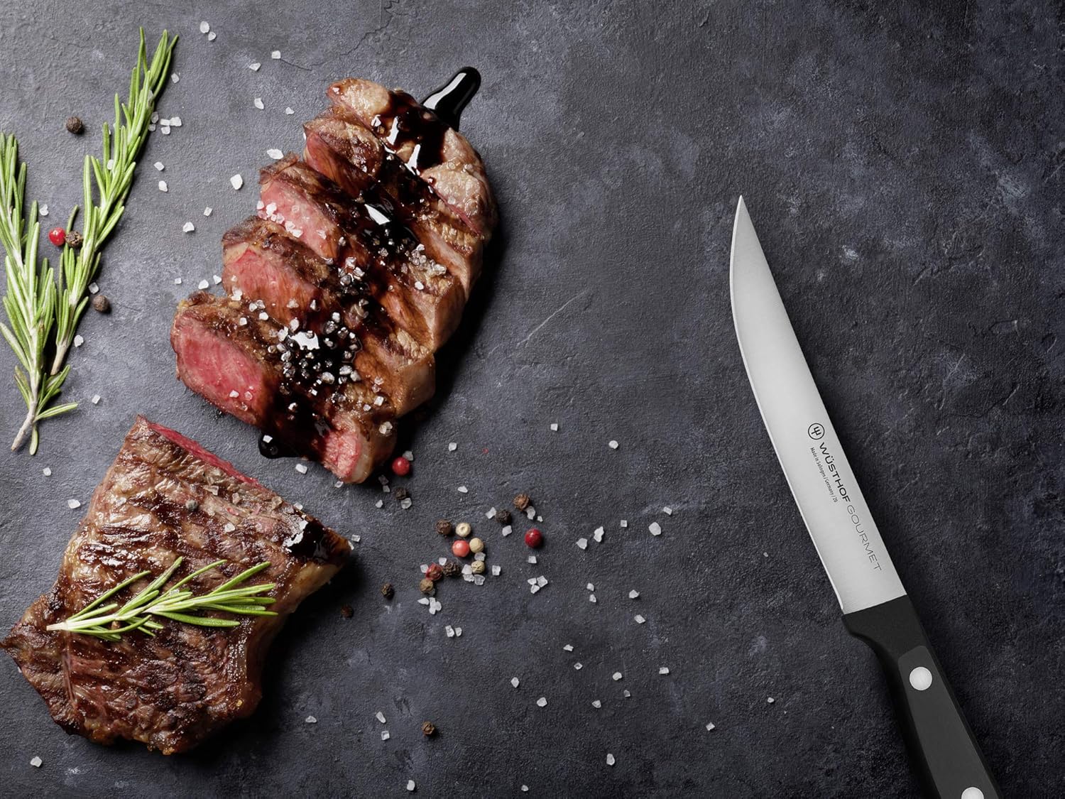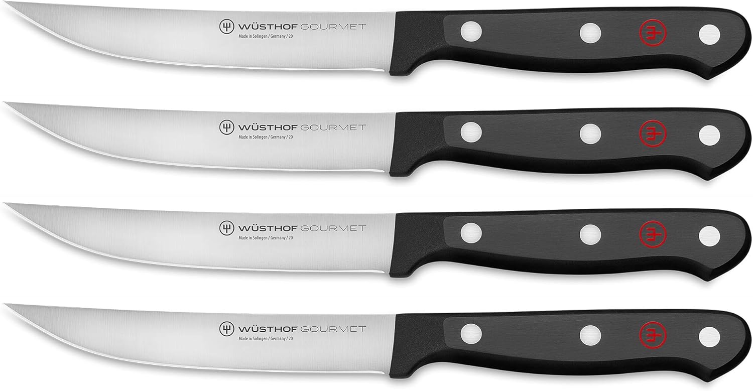 Mit Gourmet hat Wüsthof Messer Basics im Angebot, die als Messer Set (Kochmesser) nicht nur durch besondere Qualität und einen günstigen Preis begeistern, sondern als zuverlässige Solinger Messer – so wie diese Steakmesser (auch als einzelne erhältlich) Spezialklinge für mehr Fleisch-Genuss – die 4 ultrascharfen Steak Messer für Fleisch gleiten mühelos durch Fleisch-Fasern, ohne sie zu zerreißen. So schonen die Schneidemesser das gute Fleisch-Aroma: ob Rumpsteak, Schweinfilet oder Grill-Fest – lecker Scharf und stabil – die ausgelaserten Messerklingen werden in 35 Arbeitsgängen so verarbeitet, dass sie durch eine Härte von 56° Rockwell und der Verlängerung unter dem Griff mit der Stabilität und Schärfe geschmiedeter Profi Küchenmesser vergleichbar sind Agil und spülmaschinengeeignet – die ergonomischen Griffe aus Spezialkunststoff sind 3-fach vernietet und absolut pflegeleicht. Dank des geringen Gewichts ermöglichen die Fleischmesser Profi Messer präzises, schwungvolles Schneiden – viel Spaß beim BBQ Wüsthof Gourmet überzeugt durch ein sehr gutes Preis-Leistungsverhältnis und ist als Küchenmesser Set für den Privat-Haushalt ebenso interessant wie für die Gastronomie (Profiküche). Küchen Messer – Made in Germany, hergestellt in Solingen | قیمت یورویی : 85.14€