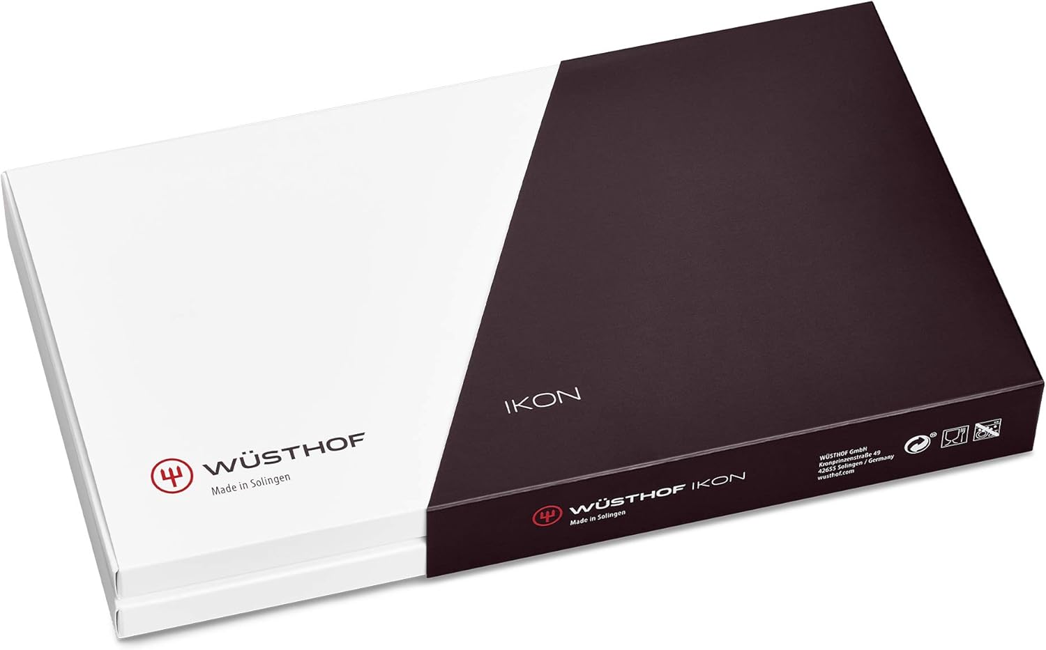 Die extrem scharfe Klinge, die optimale Balance durch die spezielle Doppelkropf-Geometrie und der erlesene, individuell gemaserte Holzgriff machen die Messer der Ikon Serie zu einem eleganten Eyecatcher – auch in der Messerauswahl von Profi-Köchen Rindersteak, Kaninchenkeule, Lammkarree: Die extrascharfen Klingen gleiten mühelos durch Fleisch-Fasern – ohne sie zu zerreißen. Mit diesem hochwertigen Steakmesser-Set schonen Sie das zarte Fleisch-Aroma und gönnen allen Sinnen einen einzigartigen Genuss Die edlen, braunen Griffe aus afrikanischem Grenadill liegen optimal in der Hand – sie sind optisch wie haptisch eine echte Besonderheit dieser Profi-Messer. Das wasserabweisende Massivholz ist ausgesprochen hygienisch und stammt aus kontrolliertem Anbau Die rostfreien Klingen mit 58° Rockwell Härte werden im laserbasierten Wüsthof Schärfverfahren geschliffen und erhalten durch erfahrene Messer-Schleifer ihre ultimative Schärfe. Die Messer sind außerordentlich belastbar und werden Sie sehr lange begleiten Die Wüsthof Ikon Messerserie ist geschmiedeter Luxus, jedes Messer ein edles Unikat. Reinigen Sie das Premium-Markenmesser nur von Hand. Gelegentliches Einölen mit haushaltsüblichem Öl hält das Holz geschmeidig. Made in Germany – geschmiedet in Solingen | قیمت یورویی : 499€