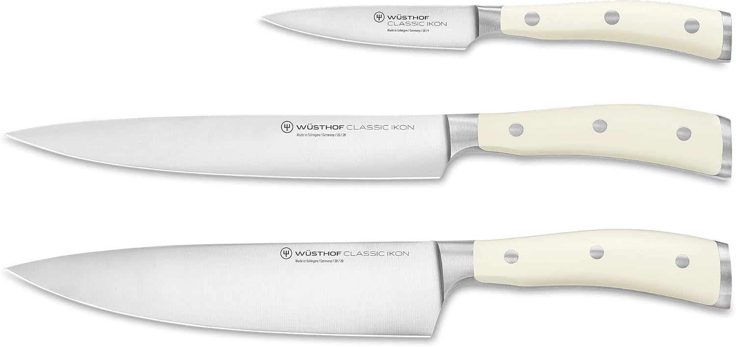 Hochwertiges Messerset mit eleganten, cremeweißen Profimessern für alle, die bei der Vor- und Zubereitung höchste Ansprüche stellen. Mit den scharfen Klingen schont das Kochmesser Set die Lebensmittel – deren natürlicher Geschmack bleibt erhalten Die Messer-Garnitur enthält 3 weiße Messer: 1 Kochmesser groß (mit 20 cm Klinge) als Allroundmesser, 1 Schinkenmesser (20 cm) als kräftiges Spezialmesser für Fleisch sowie das wendige Messer für Gemüse (9 cm) mit spitz zulaufender Klinge Dynamisches Arbeiten dank ausgewogener Balance – die spezielle Doppelkropf-Geometrie schenkt den aus Edelstahl geschmiedeten Küchenmessern ein optimales Gewicht und sorgt dafür, dass Sie damit auch bei schnellen Schnitttechniken präzise schneiden Durch die kleine Wölbung im vorderen Bereich liegen die ergonomischen Griffe besonders angenehm und sicher in der Hand. Die hellen, pflegeleichten Griffschalen sorgen für einwandfreie Hygiene und sehen auch in weißen Küchen richtig gut aus Wüsthof Classic Ikon Crème ist das nützliche Profi Messer Set der stilbewussten Köchin, die guten Messer beeindrucken zugleich als offizielles Werkzeug der deutschen Nationalmannschaft der Köche. Qualitätsmesser – Made in Germany, geschmiedet in Solingen | قیمت یورویی : 259.84€