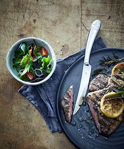 WMF Steakbesteck 12-teilig, Steakbesteck Set für 6 Personen, Steakmesser Set, Steakgabel, Cromargan Edelstahl poliert, Grillbesteck in Holzkiste لینک آمازون : https://www.amazon.de/dp/B09H7Q46DK?th=1&psc=1 محتویات: ۶ عدد چنگال استیک (طول ۲۱ سانتیمتر)، ۶ عدد چاقوی استیک (طول ۲۳ سانتیمتر) - شماره کالا: ۱۲۸۹۴۳۶۰۴۶ جنس: استیل ضد زنگ Cromargan® 18/10، براق. ضد زنگ، قابل شستشو در ماشین ظرفشویی، دارای ثبات ابعادی، بهداشتی، مقاوم در برابر اسید و عملاً غیر قابل خراب شدن، فوقالعاده بادوام. تیغههای تیز چاقو و دندانههای نوک تیز چنگال، لذت بردن از استیک را ایدهآل میکند. این سرویس باربیکیو، متشکل از شش چنگال استیک و شش چاقوی استیک، برای پیتزا نیز مناسب است. لبه دندانهدار چاقوهای استیک، تیزی مطلوب را برای سالهای آینده تضمین میکند. دسته چاقو به راحتی در دست جای میگیرد. جعبه چوبی با کیفیت بالا: صدای ملایم، نگهداری آسان در یک جعبه چوبی شیک، جلوهای خیرهکننده در هر مهمانی کبابپزی و ایدهآل برای هدیه.