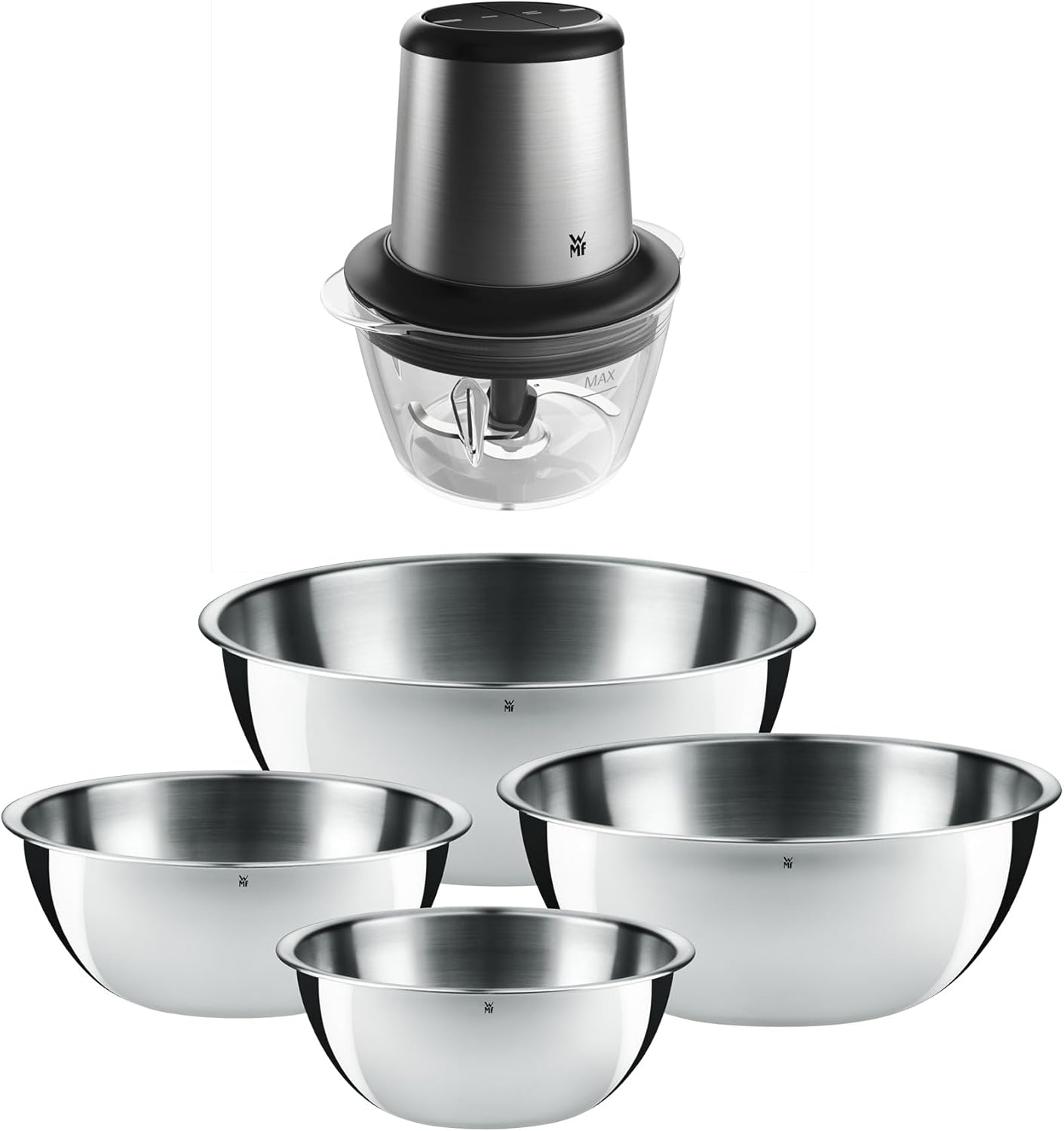 WMF Set 2-teilig Gourmet Schüsselset 4-teilig, Edelstahl Schüsseln für die Küche 0,75l - 2,75l, stapelbar und Kult X Edition Zerkleinerer elektrisch mit Glasbehälter, Blitzhacker 320 W Schüsselset und Zerkleinerer | قیمت یورویی 85.98€