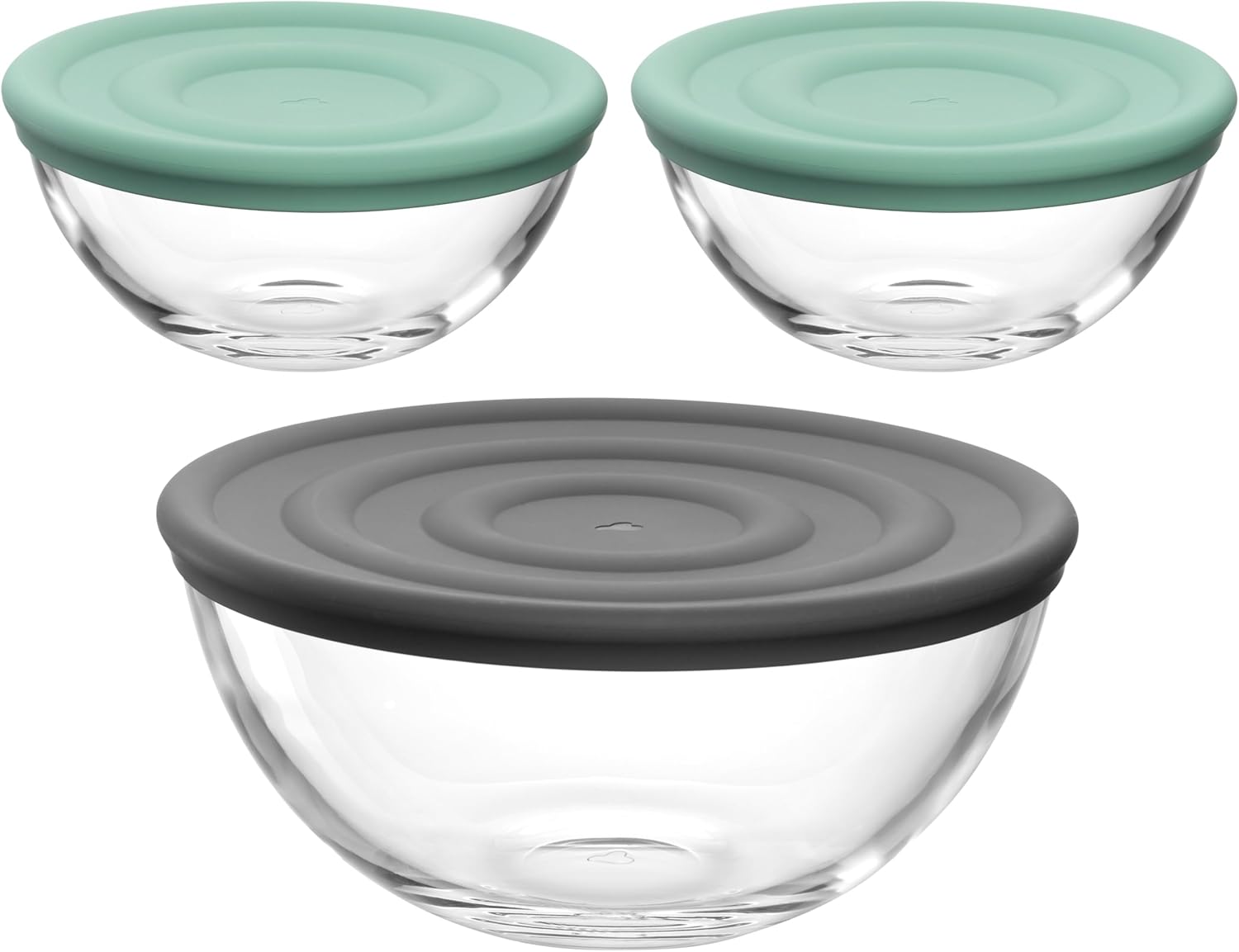 Durchdachtes Set: Drei formschöne Glasschalen in zwei Größen – ideal abgestimmt für Snacks, Salate oder Aufbewahrung im Alltag Hochwertige Deckel: Die flexiblen Silikondeckel bestehen aus medizinischem Silikon und sorgen für hygienisches, sicheres Verschließen Frische & Funktion: Perfekt zum Frischhalten und Transportieren – die Speisen bleiben geschützt, aromatisch und appetitlich Stil trifft Alltag: Das klare Design integriert sich mühelos in moderne Küchen und überzeugt durch praktische Stapelbarkeit Lieferumfang & Maße: 6 tlg. Set, mehrfarbig, 15,3 x 23,3 x 23,3 cm (HxBxT), 2,5 kg | قیمت یورویی : 42.14€