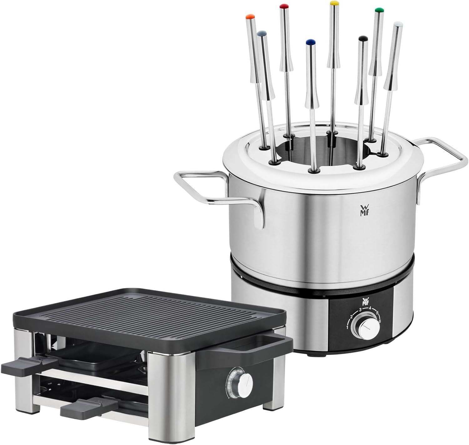 WMF Set 2-teilig Raclette Grill mit Pfännchen und Schiebern, Raclette 4 Personen, 870 W, Edelstahl und Lono Fondueset für 8 Personen, Fondue elektrisch, 1400 W, Temperaturregulierung, Gabel-Halterung | قیمت یورویی 185.98€