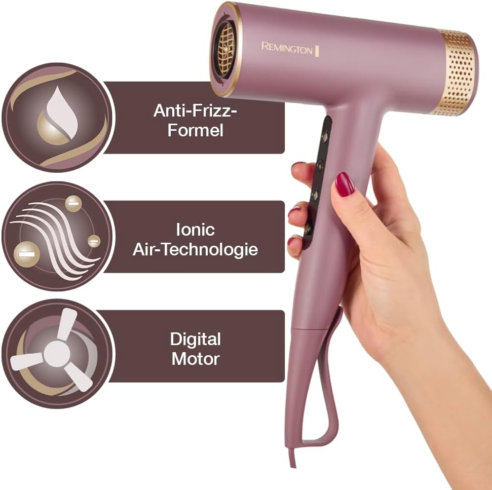 SCHNELLER HAARTROCKNER MIT DIGITALMOTOR – Bürstenloser Digitalmotor mit 110.000 U/min & 240km/h Luftstrom für ultraschnelles Trocknen IONIC AIR -TECHNOLOGIE GEGEN FRIZZ – Millionen negativer Ionen reduzieren statische Aufladung, bewahren die Feuchtigkeit bis zu 24h (Wie im REMINGTON -Labortest nach 24 Stunden gezeigt) & sorgen für glattes, glänzendes, geschmeidiges Haar. WÄRMEAKTIVIERTE MIKROWIRKSTOFFE – Dank neuer Anti-Frizz-Formel gibt der Föhn Mikrowirkstoffe ab, die dein Haar den ganzen Tag vor Frizz und Trockenheit schützen. INDIVIDUELLE EINSTELLUNGEN FÜR JEDEN HAARTYP – 12 Heiz- und Geschwindigkeitskombinationen plus Comfort+-Modus für schonendes Trocknen und perfektes Styling, abgestimmt auf deinen Haartyp. LEICHT, LEISE & EINFACH ZU BEDIENEN – 30% leichter (Wie im REMINGTON -Labortest nach 24 Stunden gezeigt), mit optimierter Akustik für sanfteren Klang (Im Vergleich zum Standard REMINGTONDC-Haartrockner), schlankem T-förmigem Design und 3m extra langem Kabel für komfortables Styling. | قیمت یورویی : 119.6€
