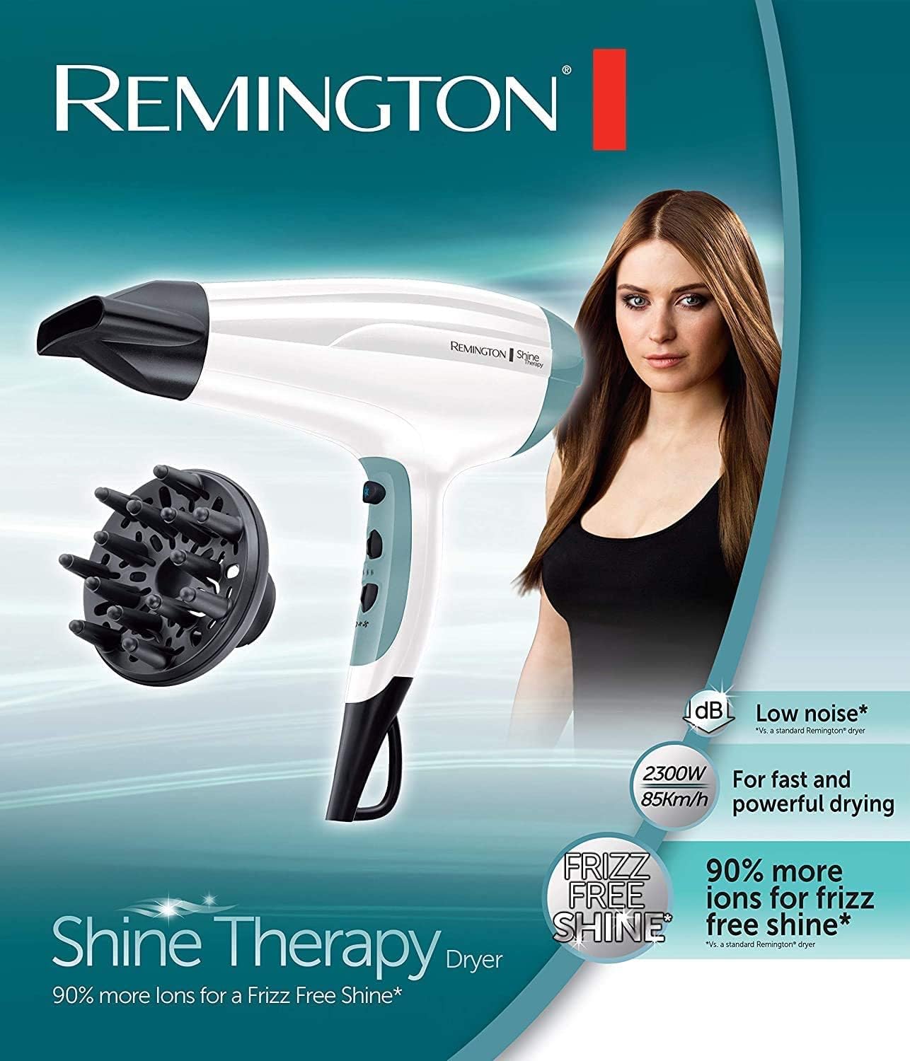 Remington Haartrockner Ionen [leicht & leise] Shine Therapy (2300 Watt, leichtes Gewicht & geringe Lautstärke, 3 Heiz- und 2 Gebläsestufen, Abkühlstufe, Stylingdüse & Diffusor), D5216 | قیمت یورویی 32.99€
