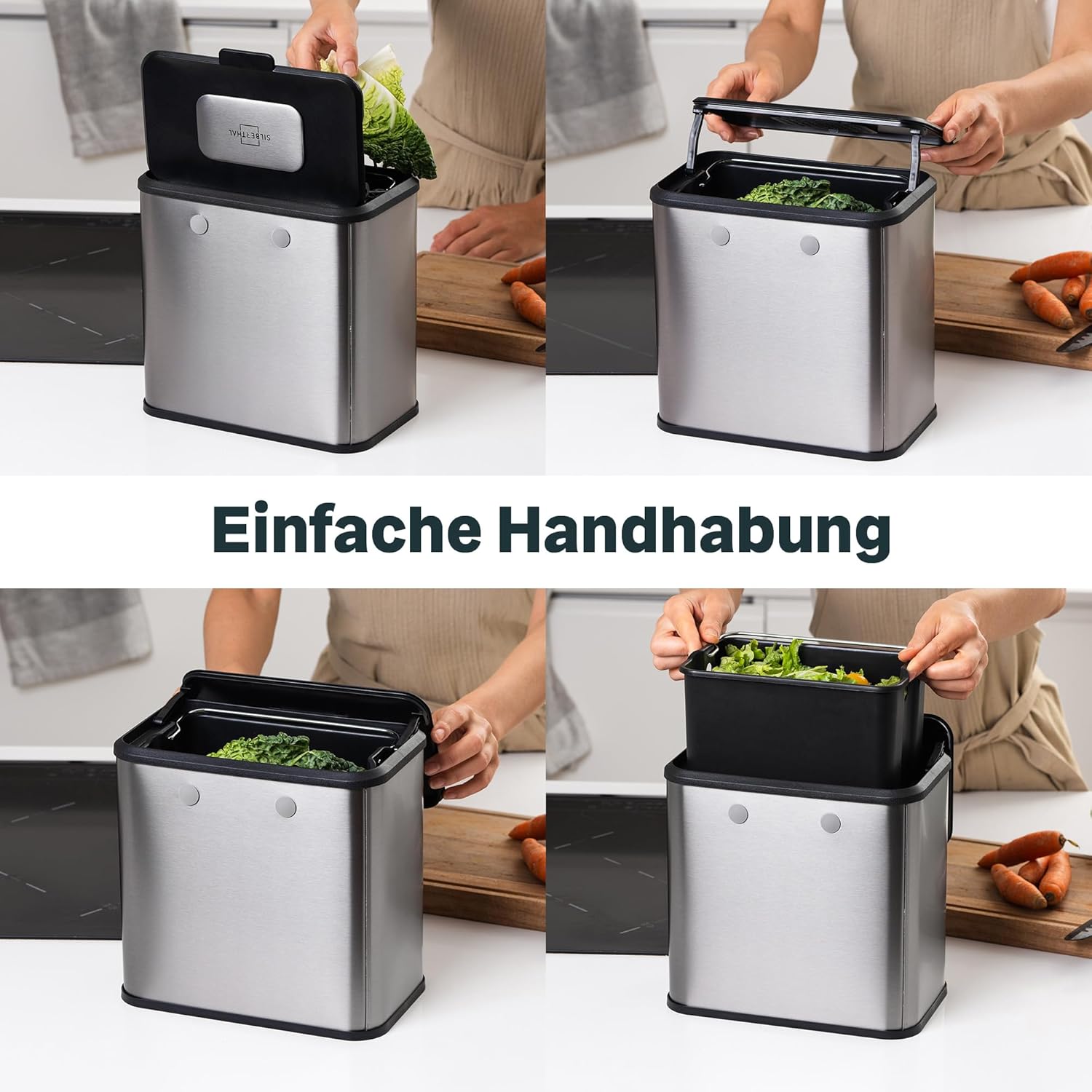 ✔ Luft- & Geruchsdicht – Kompostbehälter 4 Liter aus Edelstahl mit abnehmbarem Innenbehälter aus Kunststoff. Perfekt für den Biomüll von Paaren und kleinen Haushalten. ✔ Leicht zu reinigen– Der Mülleimer im Inneren lässt sich mühelos herausnehmen, leeren, säubern. Der Bioabfallbehälter kann in der Geschirrspülmaschine gereinigt werden, der Rest kinderleicht von Hand. ✔ Weniger Gerüche & Insekten – Der im Deckel integrierte Kohlefilter reduziert die Geruchsbildung und die Anziehung von Insekten auf den Abfall. 4 Filter zum Wechseln sind inklusive und reichen für ein ganzes Jahr. ✔ Platzsparend – Bio Mülleimer zum Stehen auf der Küchentheke, dem Tisch, dem Balkon oder zum Einhängen oder Kleben am Schrank. Die Teile zum Kleben oder Einhängen werden mitgeliefert. ✔ Mit und Ohne Müllbeutel - Bei Bedarf kann der Eimer mit als auch ohne Tüte genutzt werden. Für Tüten befinden sich extra Halterungen, um Müllbeutel an ihrer Position zu halten. | قیمت یورویی : 36.95€