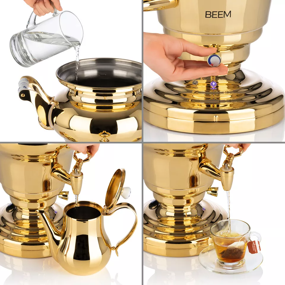 سماور برقی Beem مدل Odessa با ظرفیت 3 لیتر و بدنه استیل ضدزنگ با آبکاری طلا، ترکیبی از زیبایی سلطنتی و عملکرد مدرن را در اختیار شما میگذارد.