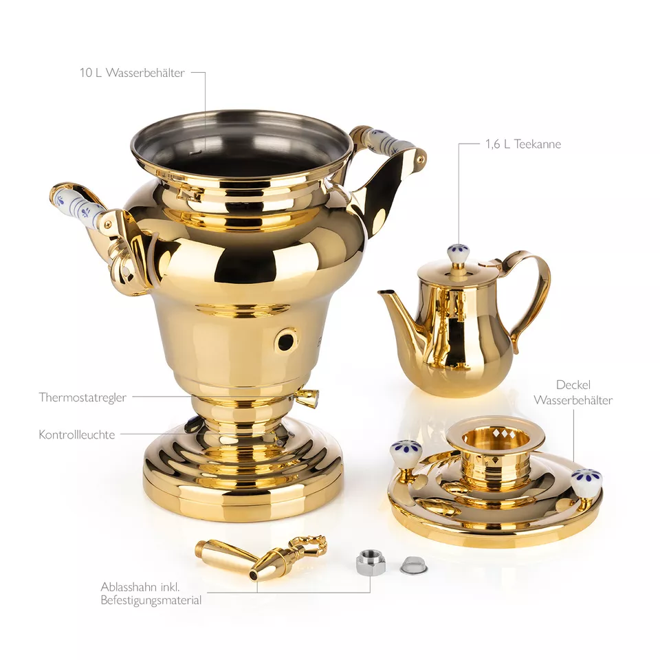 سماور برقی Beem Odessa 3L Vergoldete Edelstahl-Samowar یک انتخاب باشکوه برای کسانی است که علاوه بر کیفیت، به ظاهر لوکس و چشمنواز نیز اهمیت میدهند. بدنهی استیل ضدزنگ این مدل با آبکاری طلایی براق پوشیده شده که جلوهای شاهانه به فضای پذیرایی شما میدهد.