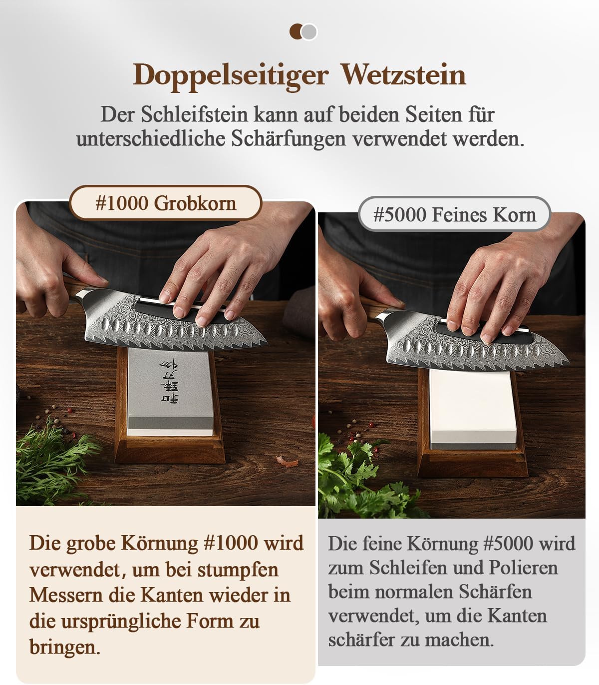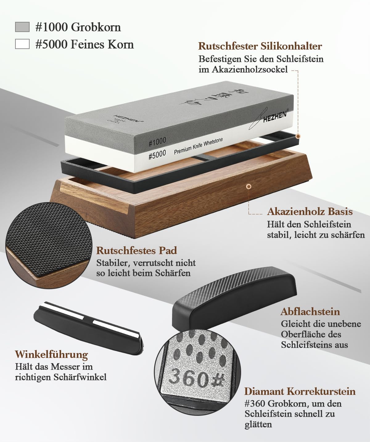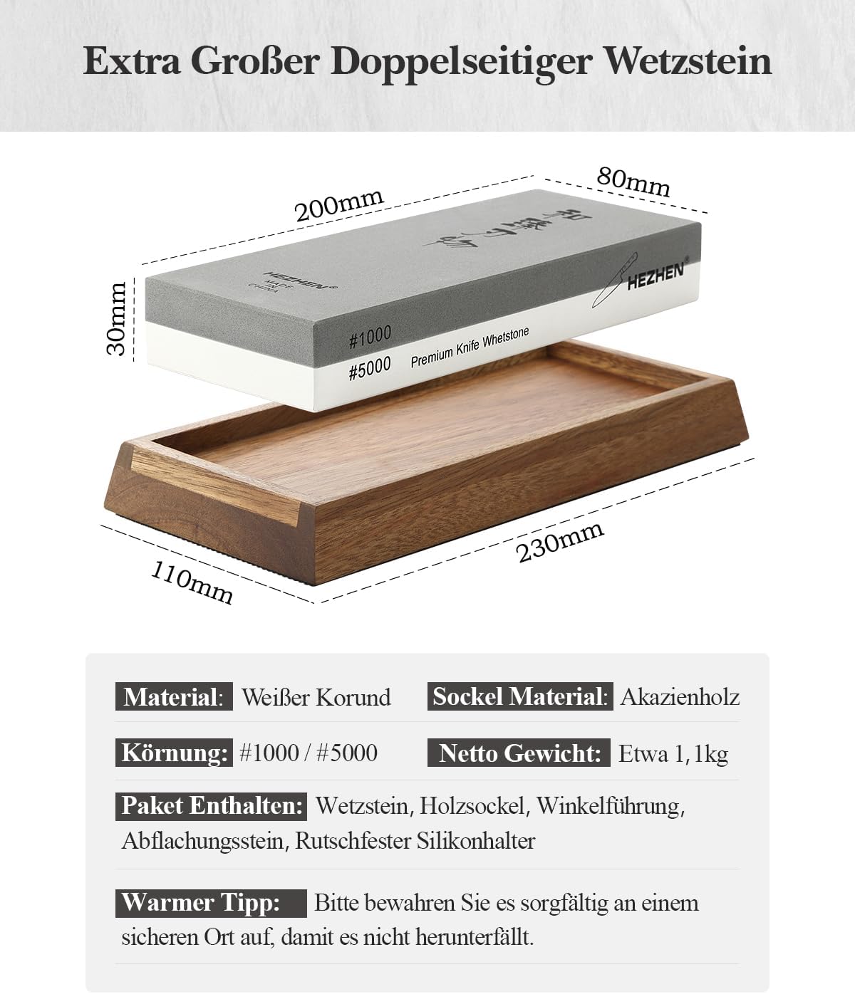 HEZHEN Doppelseitiger Abziehstein, Groß Weißkorund Schleifstein Wetzstein, Professionell Messerschärfer, Körnung1000/5000 mit Rutschfestem Akazienholz Basis, Abflachungsstein,Winkelführung #1000/5000