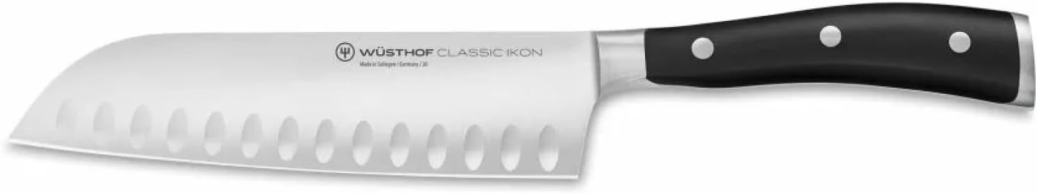Als elegante Profi Kochmesser aus Solingen beeindrucken die Wüsthof Messer der Classic Ikon Serie selbst anspruchsvolle Perfektionisten. So ist auch dieses Messer als japanisches Kochmesser mit Kullenschliff ein scharfes Küchen Messer mit zeitlosem Design Das japanische Santokumesser (17cm Klinge) ist kräftig und vielseitig: ob Wiegen und Hacken von Kräutern, Gemüse und Obst oder Schneiden von Fleisch und Fisch (Sushi Messer, japanisches Messer) – äußerst scharfe Klinge für hauchdünne Schnitte Die langlebige Klinge des Santoku Messer erhält in Handarbeit den finalen Polierabzug, also ihre extreme Schärfe. Die beidseitige Gewichtung des Griffes (Doppel-Kropf) sorgt für verblüffend präzises Handling – auch bei schnellen Schnitttechniken Die geschliffenen Kullen (kleinen Vertiefungen) bilden Luftpolster und verhindern so das Ankleben von feinen Scheiben. Ergonomischer Griff – durch die kleine Wölbung im vorderen Bereich liegt das ultrascharfe Schneidemesser besonders sicher in der Hand Als ideal ausbalanciertes Kochmesser beeindruckt Wüsthof Classic Ikon jeden Profi-Koch und ist dank der scharfen Messerklinge das offizielle Kochwerkzeug der deutschen Nationalmannschaft der Köche. Premiummesser – Made in Germany, geschmiedet in Solingen | قیمت یورویی : 135.88€
