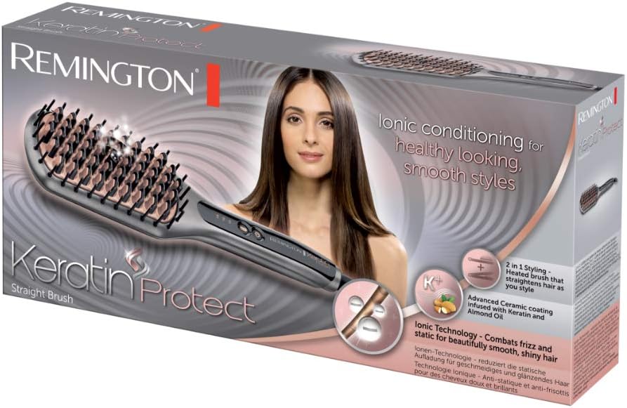 Remington Glätteisen & Haarbürste für eine reduzierte Stylingzeit (Keratin-Keramikbeschichtung mit Mandelöl angereichert, Digitales Display, 150-230°C) CB7480, Ionen-Technologie, Grau/Rose Gold Glättbürste لینک آمازون : https://www.amazon.de/dp/B073ZDGXYV?th=1&psc=1 برس مو و صاف کننده مو تنها در یک محصول برای کاهش زمان حالت دادن مو موهایی با روکش سرامیکی باکیفیت، غنیشده با کراتین و روغن بادام برای داشتن موهایی صاف، براق و سالم. ژنراتور یون، الکتریسیته ساکن را کاهش میدهد و موهایی صاف و نرم به شما میدهد. نمایشگر دیجیتال با ۳ تنظیم دما از ۱۵۰ تا ۲۳۰ درجه سانتیگراد (۱۵۰/۱۹۰/۲۳۰) مناسب برای فرها و امواج طبیعی سبک، انتهای موهای فر خنک، زمان گرم شدن 30 ثانیه، کابل 3 متری سالنی