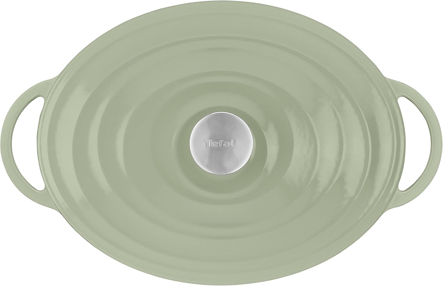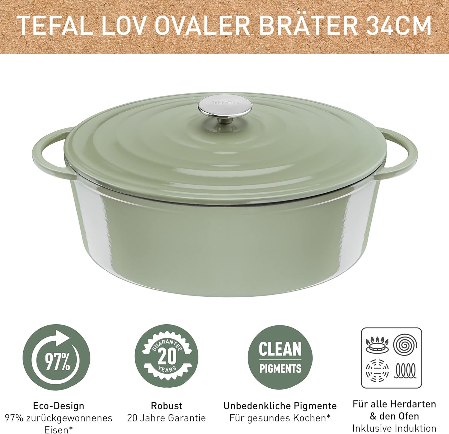Tefal E25806 LOV Ovaler Bräter 34 cm | wiedergewonnenes Gusseisen | optimale Wärmespeicherung | für alle Herdarten | induktionsgeeignet | backofengeeignet bis 250°C | spülmaschinenfest | Hellgrün Hellgrün Ovaler Bräter 34 cm | قیمت یورویی 224€