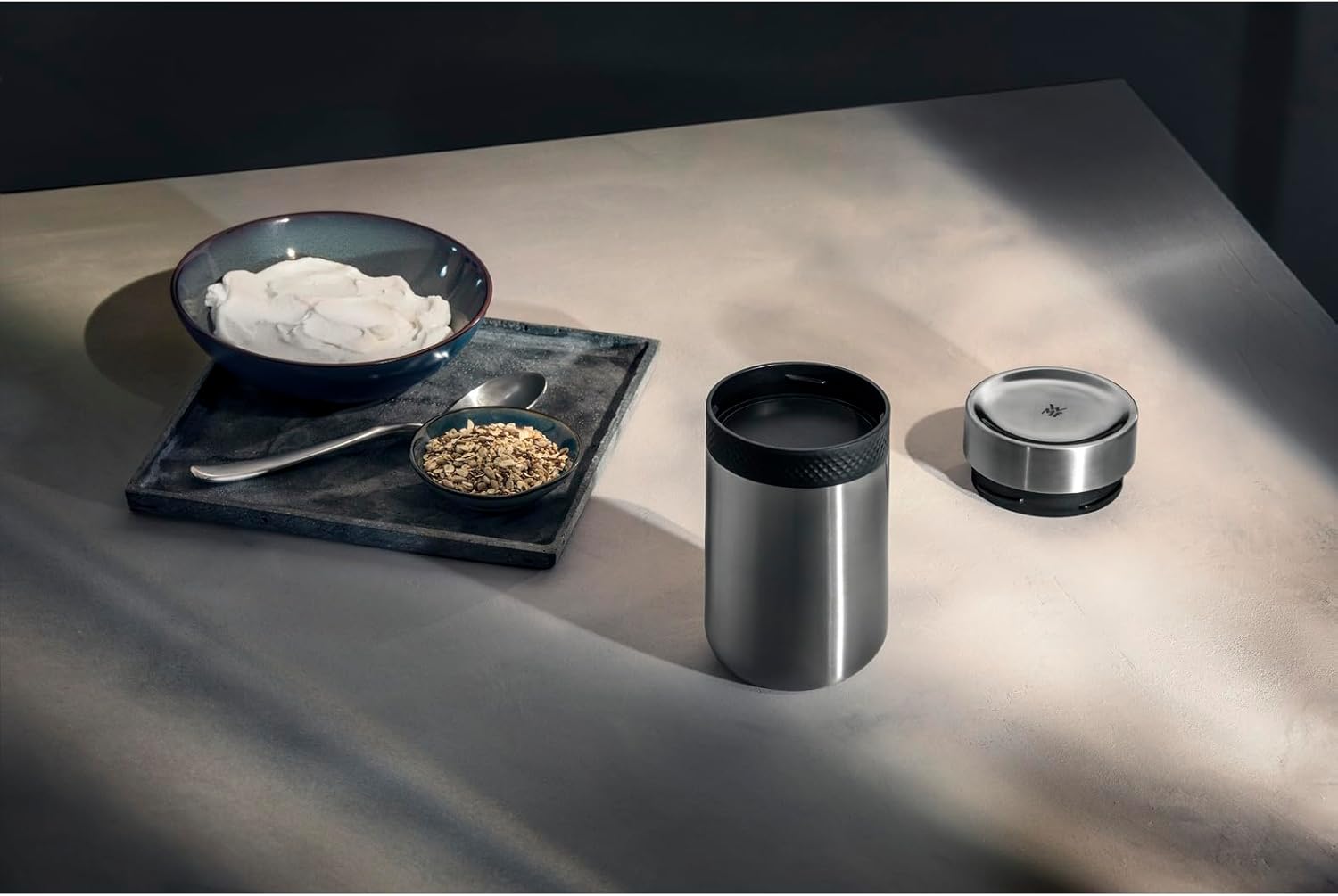 WMF my2Go Thermo Speisebehälter 300ml Isolierbehälter und 200ml Zusatzbehälter, umweltfreundlich, Cromargan Edelstahl mattiert, spülmaschinengeeignet Isolierbecher 300 ml und 200 ml Zusatzbehälter لینک آمازون : https://www.amazon.de/dp/B0D1814G6P?th=1&psc=1 محتویات: ۱ عدد ظرف غذای حرارتی شامل یک ظرف عایقدار ۳۰۰ میلیلیتری و یک ظرف اضافی ۲۰۰ میلیلیتری (ارتفاع ۱۴.۵ سانتیمتر، قطر ۹.۵ سانتیمتر) - شماره کالا: ۳۲۰۱۱۲۵۹۸ جنس: استیل ضد زنگ Cromargan® 18/10 (دوام استثنایی و بهداشت مطلوب)، پلاستیک. قابل شستشو در ماشین ظرفشویی، بدون طعم، مقاوم در برابر اسید مواد غذایی، رنگ ثابت و تمیز کردن آسان. عایق دوجداره و باکیفیت ThermaPro ظرف اصلی (300 میلیلیتر) مواد سرد را تا 12 ساعت سرد و مواد گرم را تا 6 ساعت گرم نگه میدارد. ظرف اضافی ۲۰۰ میلیلیتری روی آن، سایر مواد را تا زمان صرف غذا تازه نگه میدارد. ایدهآل برای موسلی خوشمزه یا میوههای ترد با ماست خنک، یا نان تست ترد با سوپ داغ. ظرف غذای My2Go کاملاً ضد نشت است - برای داشتن احساسی خوب و ایمن در حین حرکت.