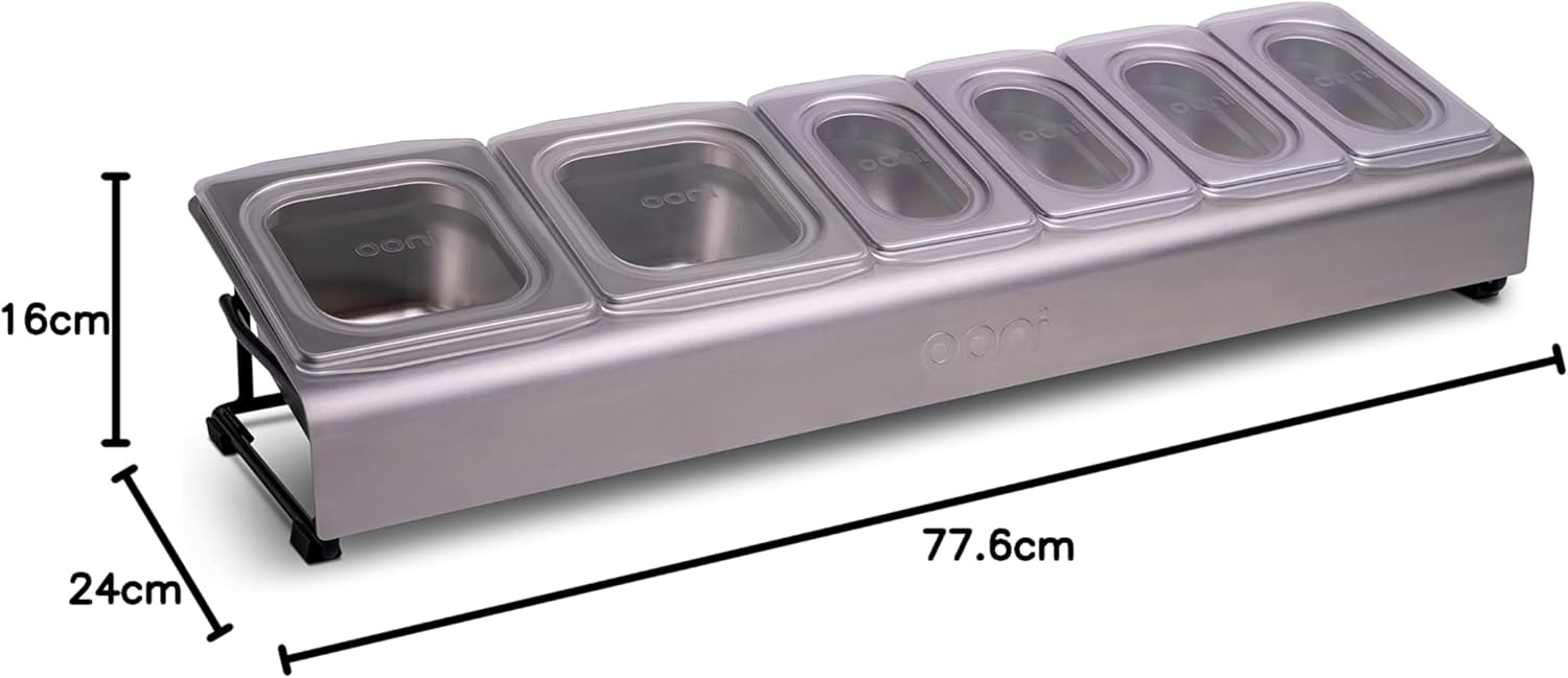 GREAT PIZZA – Ein Motto, das Ooni Pizza Ovens lebt - Wir glauben, dass jeder eine gute Pizza verdient und alle unsere Edelstahl-Pizza Zutaten Behälter wurden mit diesem einzigen Zweck im Hinterkopf entworfen und entwickelt! PIZZA PARTY – Bereite dich auf deine Pizza-Partys mit Stil vor - mit der Ooni Pizza Topping Station, damit die Pizza nicht ausgeht! Die zwei 1,6-Liter- und vier 0,8-Liter-Edelstahl Behälter machen sie zu einem hervorragenden Werkzeug für die Vorbereitung von Zutaten und Belägen. OUTDOOR KÜCHE – Dank der passgenauen, durchsichtigen Deckel für jeden Gastro Behälter lassen sie sich leicht stapeln und im Kühlschrank aufbewahren. Das einfach zu transportierende System macht den Wechsel von der Innen- zur Außenküche zum Kinderspiel! NEXT LEVEL PIZZA PREP – Speziell entwickelt, um perfekt auf unsere Ooni Modular Tische zu passen, wird die Ooni Pizza Topping Station Ihnen helfen, Ihre Pizzazubereitung zu verbessern! Vergessen Sie nicht das andere Ooni-Pizzaofen Zubehör, das speziell für unsere Pizzaöfen entwickelt wurde. EINFACHE REINIGUNG – Der wetterfeste, pulverbeschichtete Rahmen und die Edelstahlabdeckung sind einfach mit warmem Seifenwasser zu reinigen. Der abnehmbare Edelstahlbehälter und Deckel sind spülmaschinenfest und die Deckeldichtung lässt sich zur besseren Reinigung leicht entfernen. | قیمت یورویی : 129€