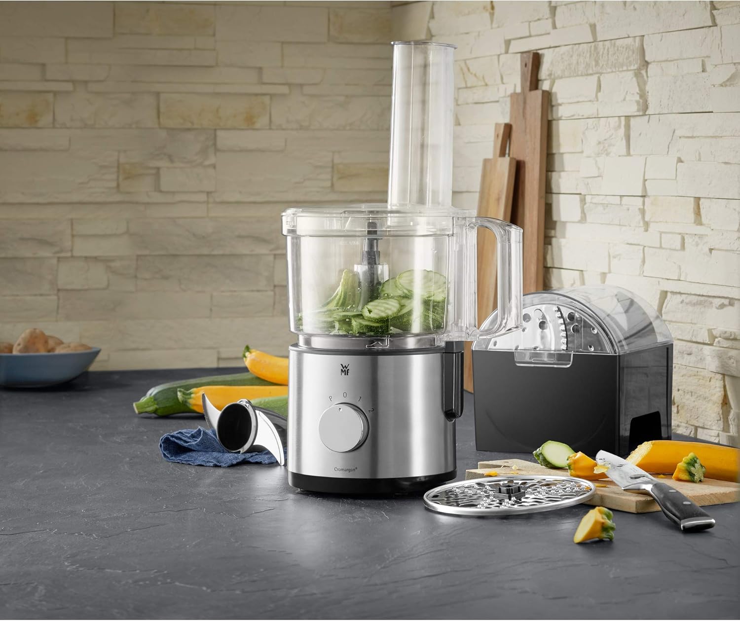 WMF Kult X Edition Küchenmaschine Zerkleinerer mit 5 Zubehör-Scheiben, Knetmesser, Stopfen, Edelstahl-Messer, Behälter 2,0l, 500 W Single | قیمت یورویی 114.99€